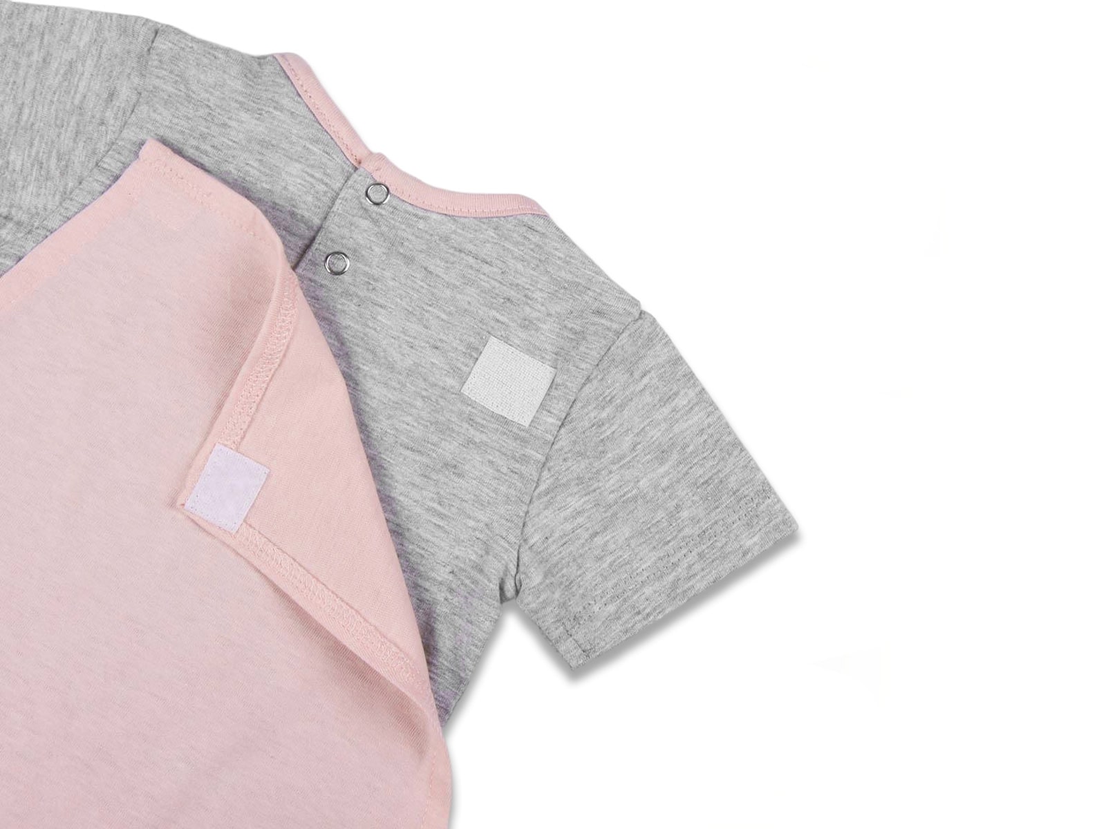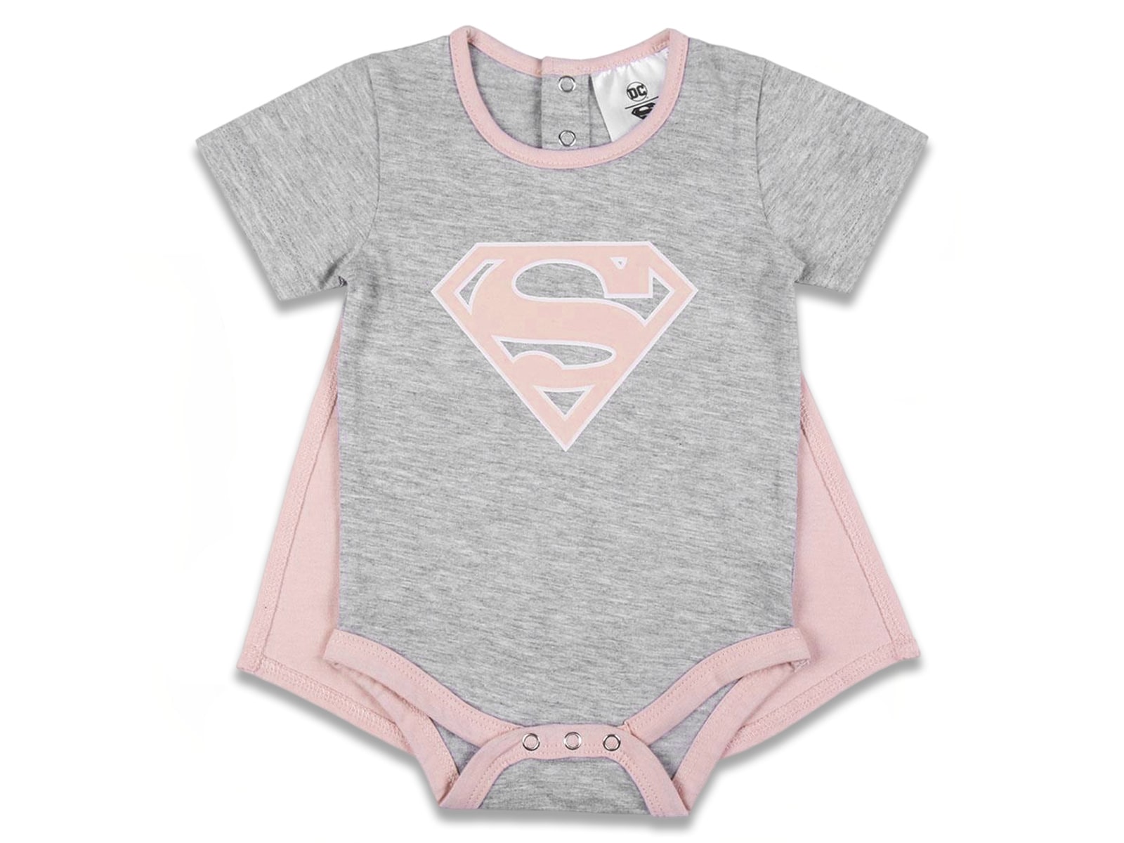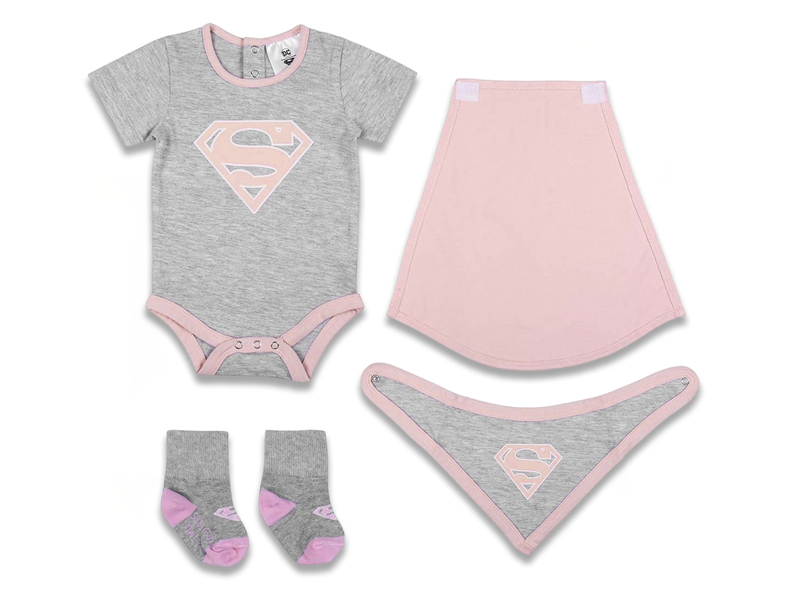 Το σετ αυτό αποτελείται από 4 κομμάτια, κοντομάνικο κορμάκι, σαλιάρα, καλτσούλες και κάπα. Είναι από την εταιρία DC Comics και είναι η στολή της αγαπημένης υπερήρωα των κοριτσιών Σούπερ-Γυναίκας (Super-Woman). Το κορμάκι είναι κοντομάνικο σε γκρι χρώμα με σομόν λεπτομέρειες με το λογότυπο της Σούπερ-Γυναίκας και έχει τρουκς (κόπιτσες) στο κάτω μέρος του για μεγαλύτερη ευκολία αλλαγής πάνας. Οι καλτσούλες και η σαλιάρα είναι ασορτί με το κορμάκι. Το σετ ολοκληρώνετε με την μπέρτα (κάπα) η οποία είναι μονόχρωμη σομόν! Είναι ιδανικό για να απογειώσει το στυλ των μικρών μας κοριτσιών!