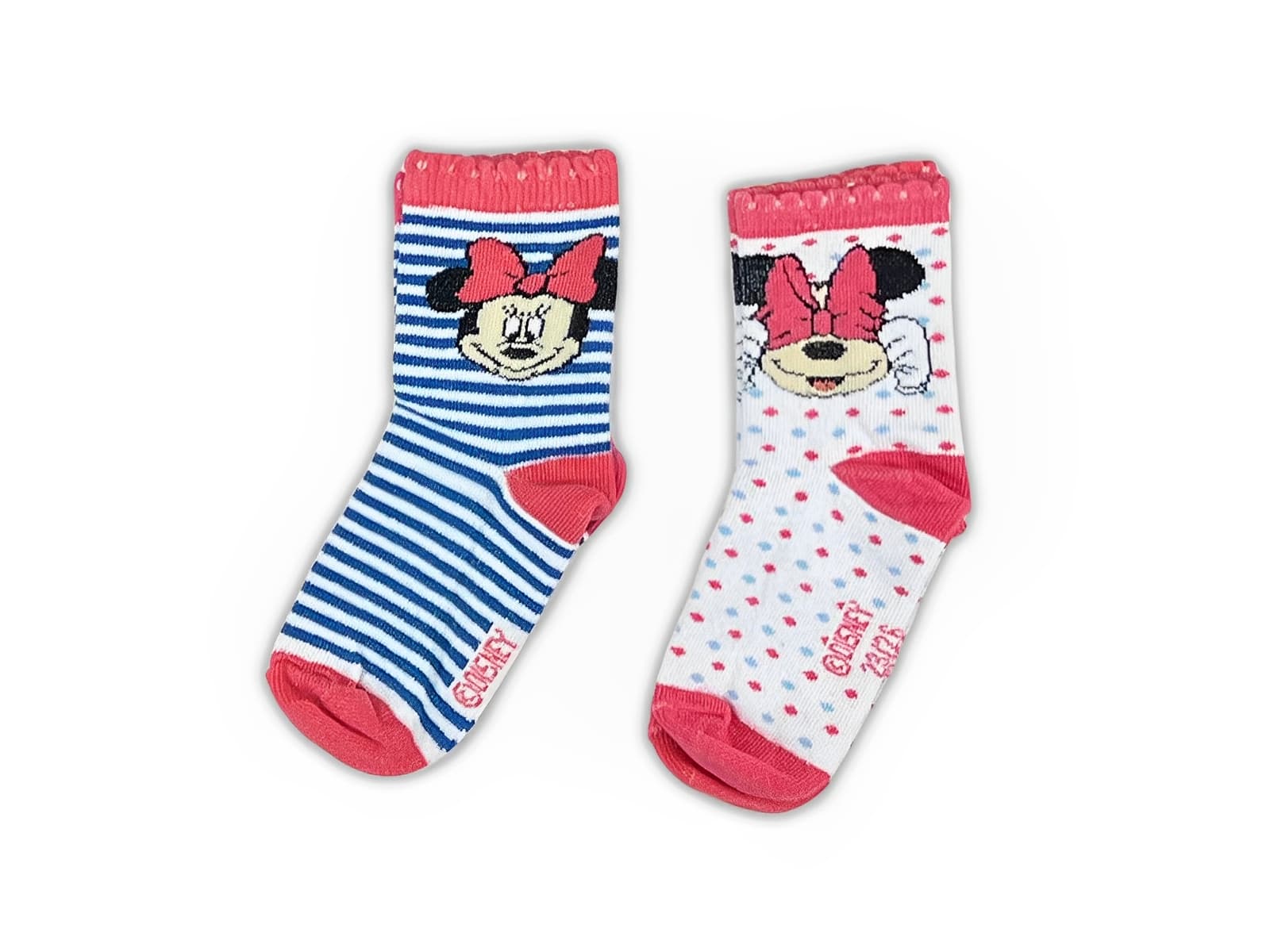 Συσκευασία 2 ζευγάρια καλτσούλες βρεφικές από την εταιρία Disney οι οποίες έχουν διαφορετικά σχέδια και χρώματα με την αγαπημένη ηρωίδα κινουμένων σχεδίων Μίνι Μάους ( Minnie Mouse ). Το ένα ζευγάρι είναι ριγωτό και το άλλο πουά.