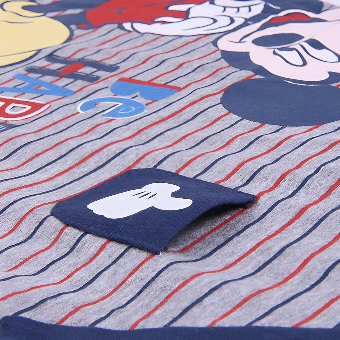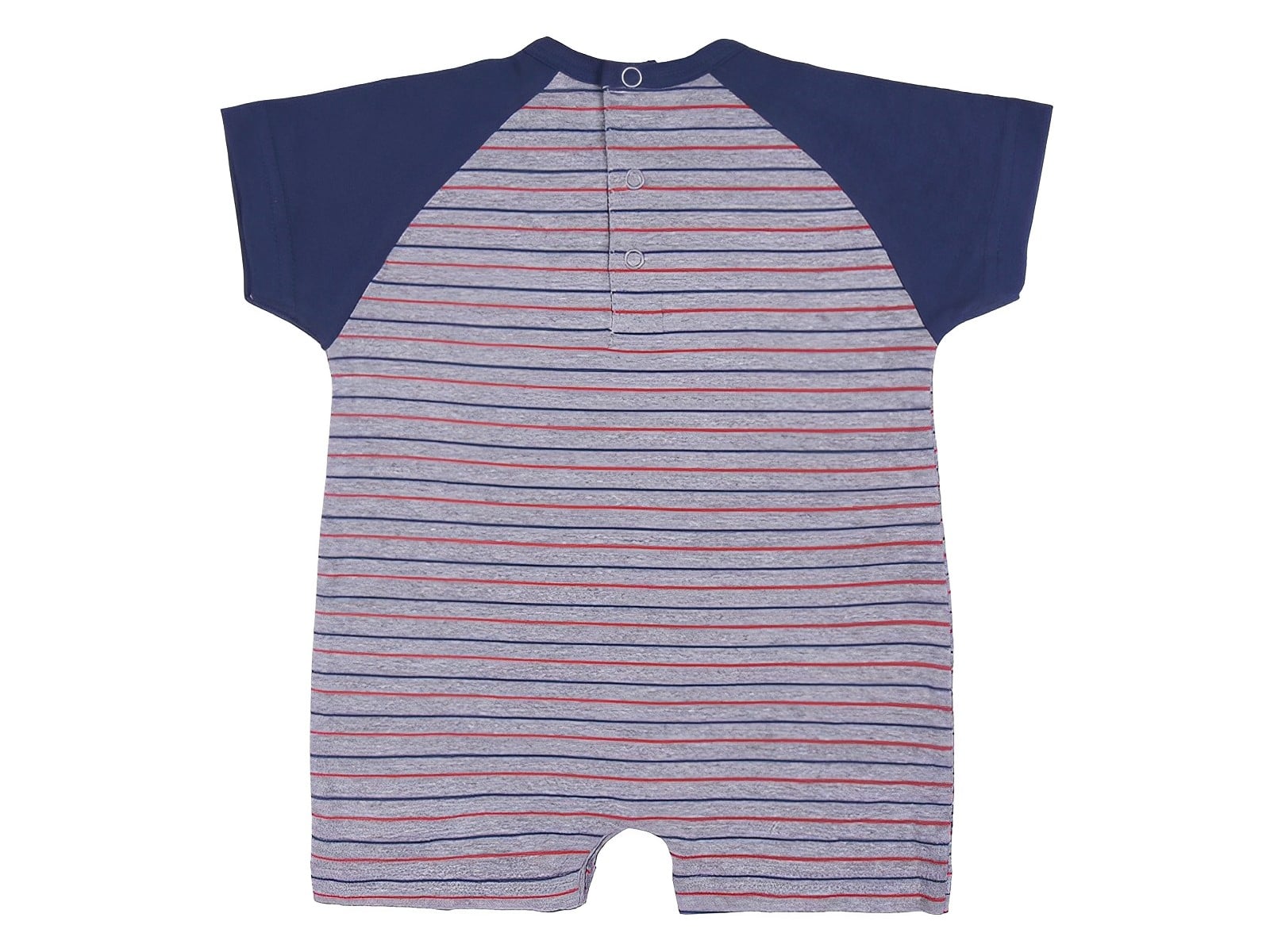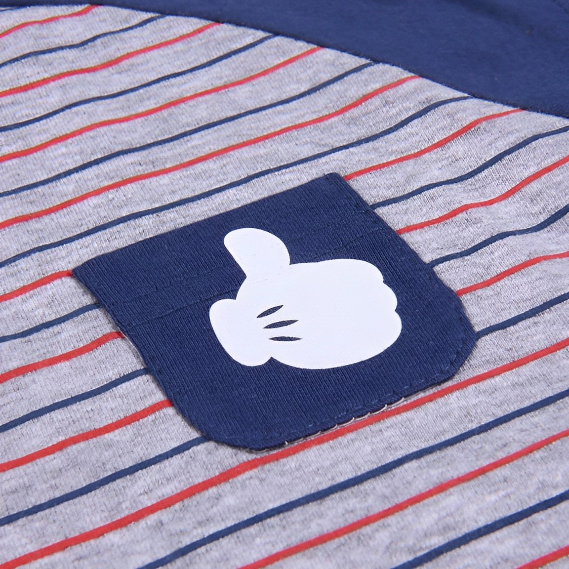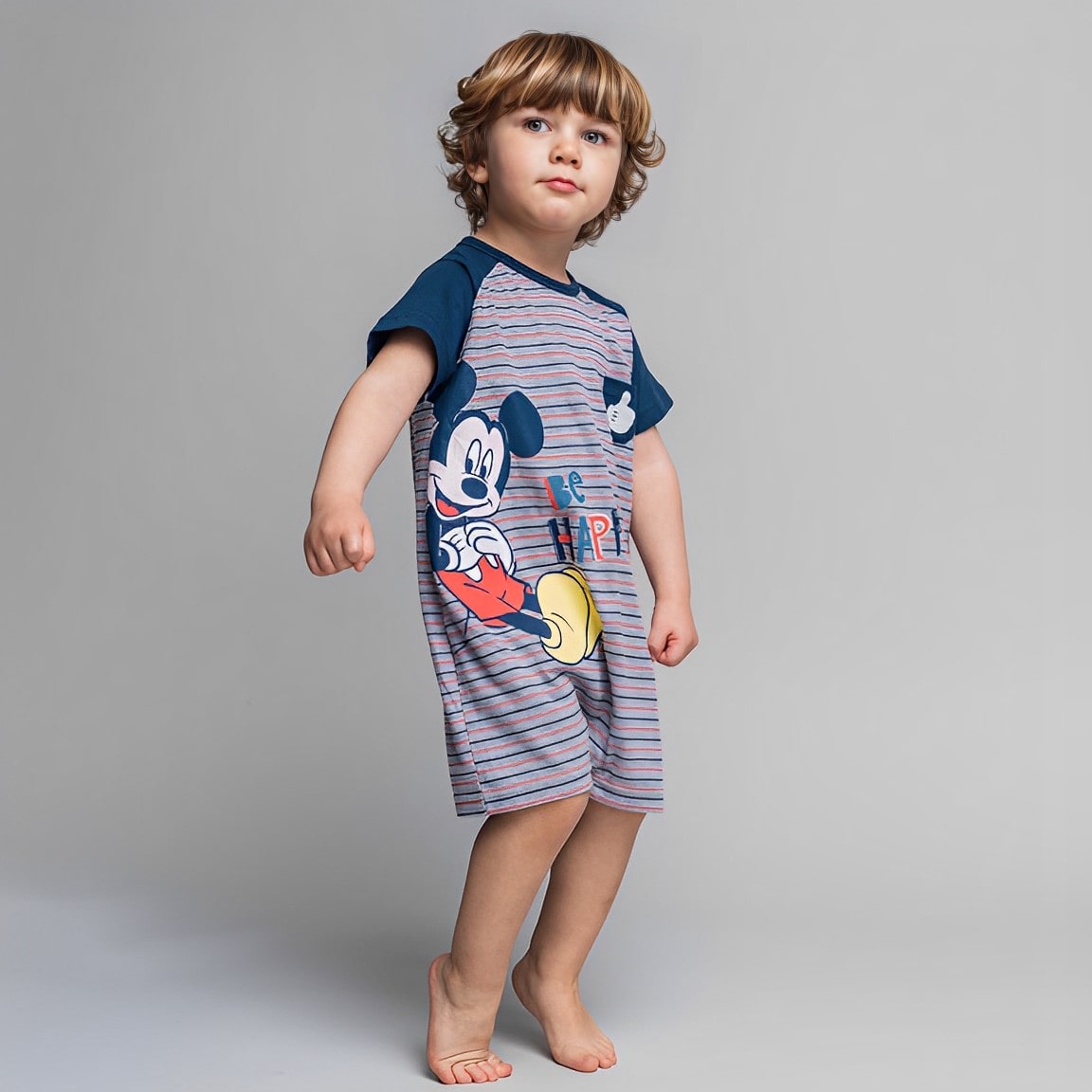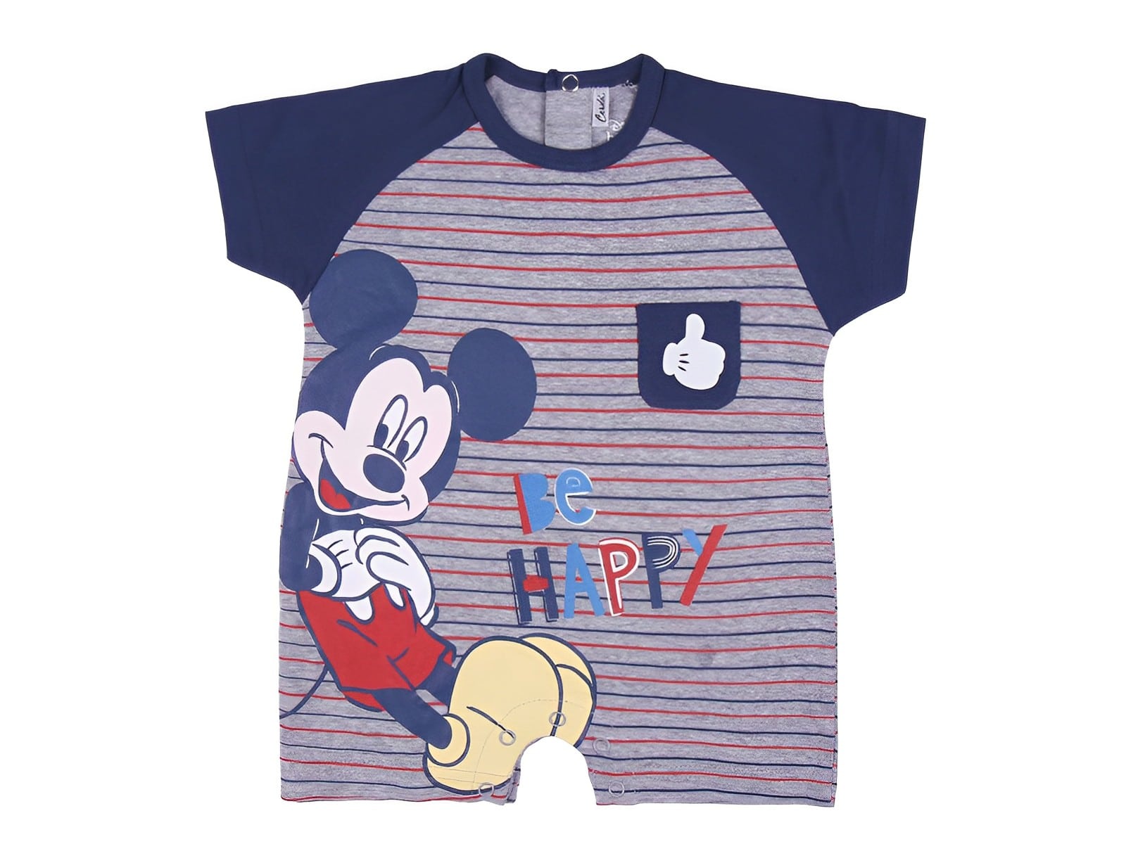 Ριγέ φορμάκι κοντομάνικο καλοκαιρινό από την εταιρία Disney σε σκούρο μπλε χρώμα με σχέδιο τον αγαπημένο ήρωα των κινουμένων σχεδίων, Μίκι Μάους (Mickey Mouse). Στο ύψος του στήθους υπάρχει τσεπούλα, ενώ στο τελείωμά του το φορμάκι έχει ανοιχτά ποδαράκια και άνοιγμα με τρουκς στο κάτω μέρος, για εύκολη αλλαγή πάνας.