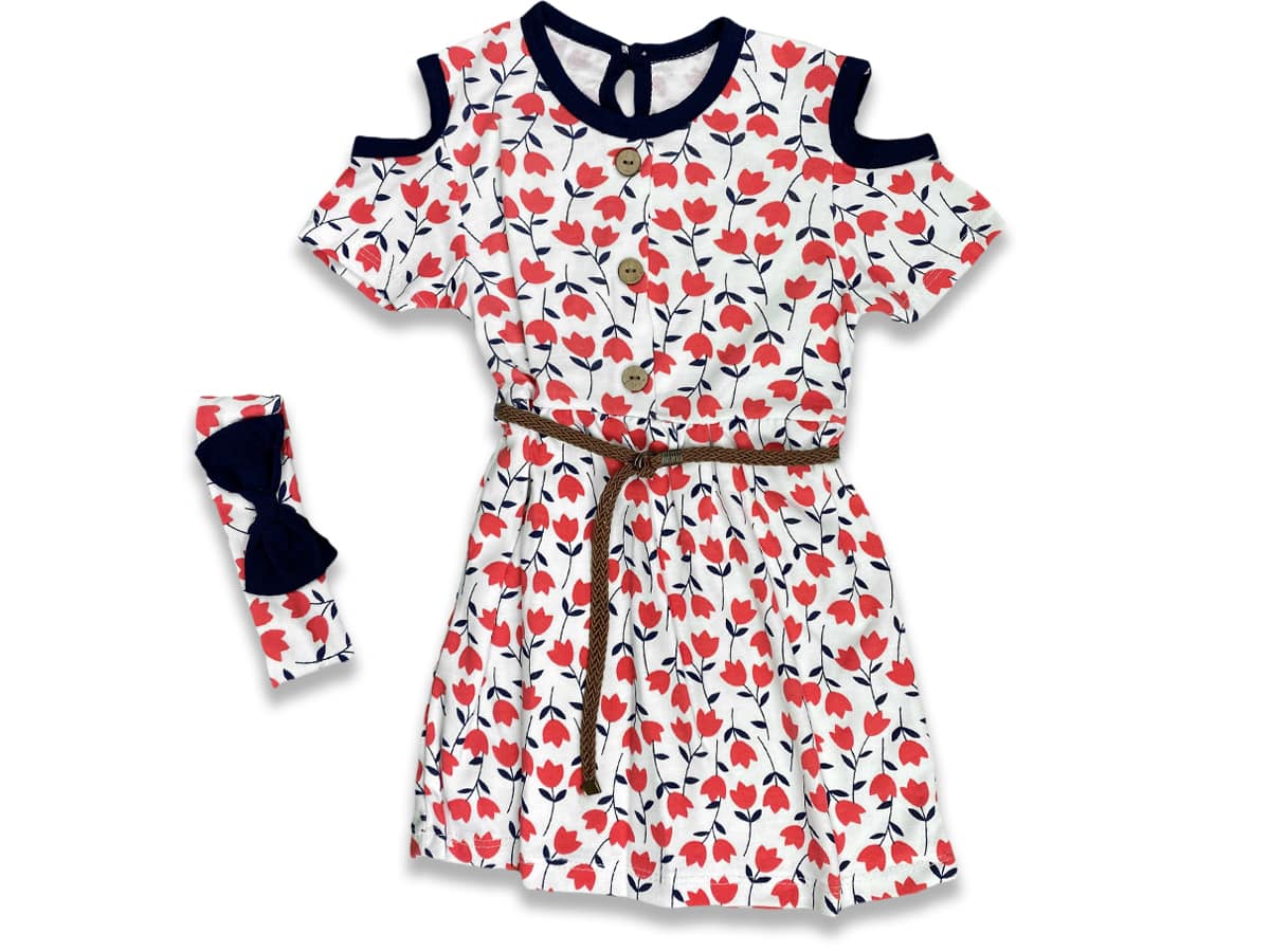 Φορεματάκι κοντομάνικο με κομμένους ώμους, με ζώνη και κορδέλα για το κεφαλάκι, με σχέδιο λουλουδάκια σε άσπρο και σκούρο μπλε χρώμα. Ενδέχεται τα χρώματα να διαφοροποιούνται ελάχιστα με αυτά της φωτογραφίας.