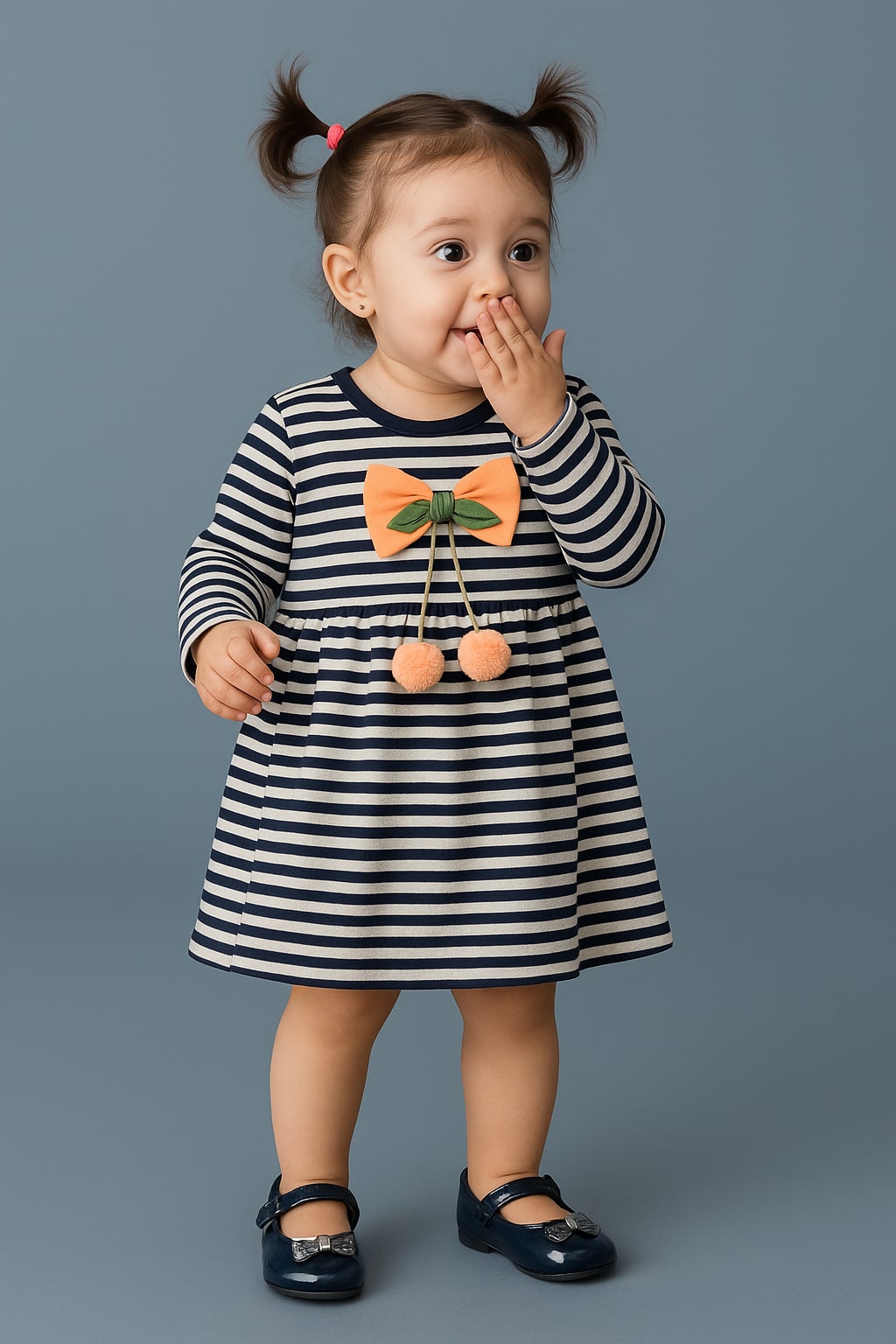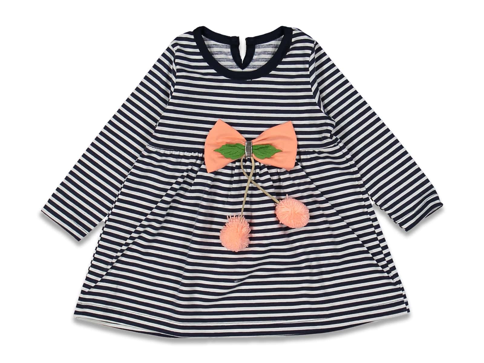 Φορεματάκι μακρυμάνικο ριγέ μαύρο – άσπρο χρώμα όπου έχει φιογκάκι και πον πον σε σομόν χρώμα.