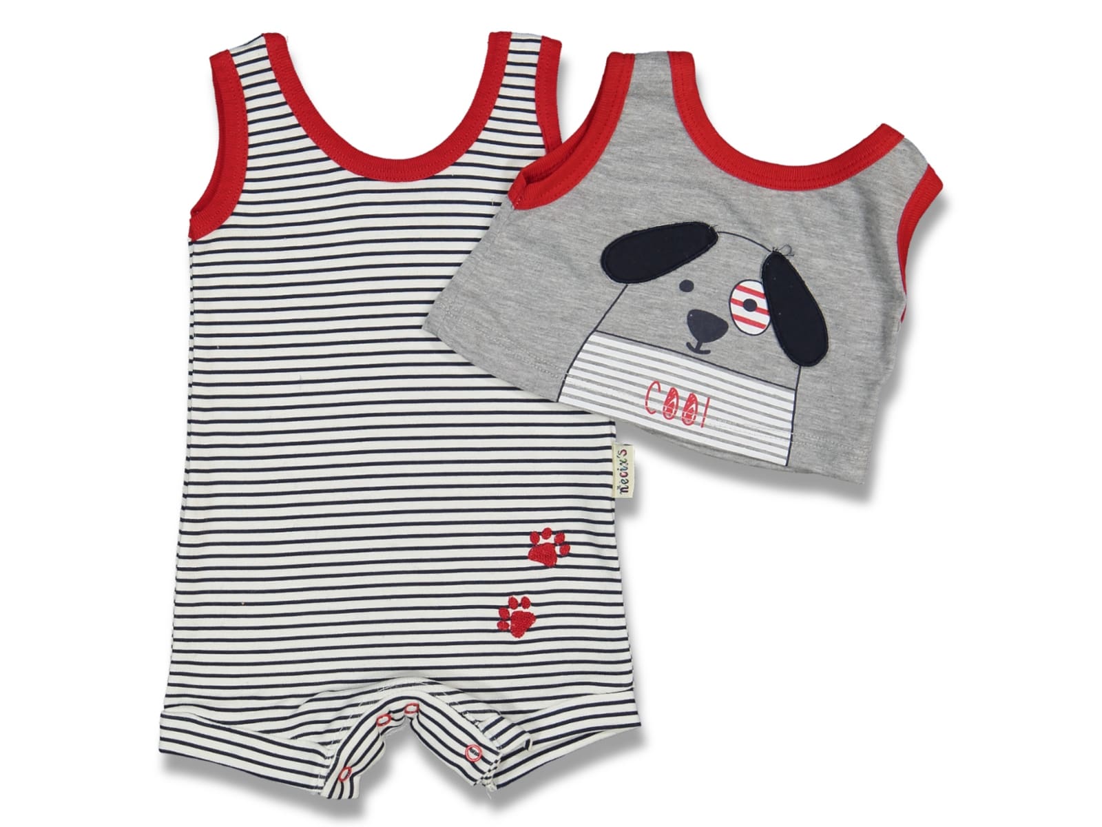 Αμάνικο καλοκαιρινό φορμάκι και μπλουζάκι αμάνικο με ρίγες και σχέδιο απλικέ σκυλάκι κόκκινο, ενώ γράφει και “Cool”. Άνοιγμα με τρουκς στο κάτω μέρος για εύκολη αλλαγή πάνας.
