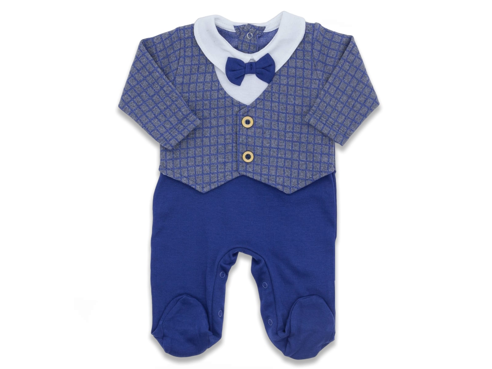 Φορμάκι εξόδου ενιαίο με γιλεκάκι και γιακά και κολλημένο παπιγιόν. Το γιλεκάκι είναι σε μπλε χρώμα με καρό σχέδιο, ενώ το φορμάκι είναι σε μπε – άσπρο χρώμα. Το παπιγιόν είναι μπλε μονόχρωμο. Στο τελείωμά του το φορμάκι έχει κλειστά ποδαράκια και ανοίγει με κόπιτσες ( τρουκς ).