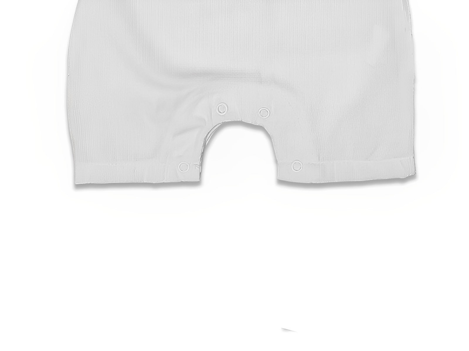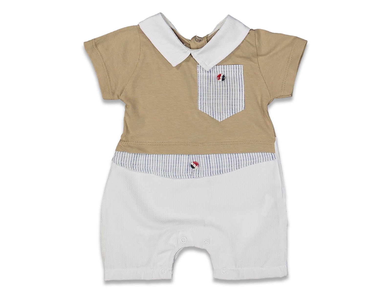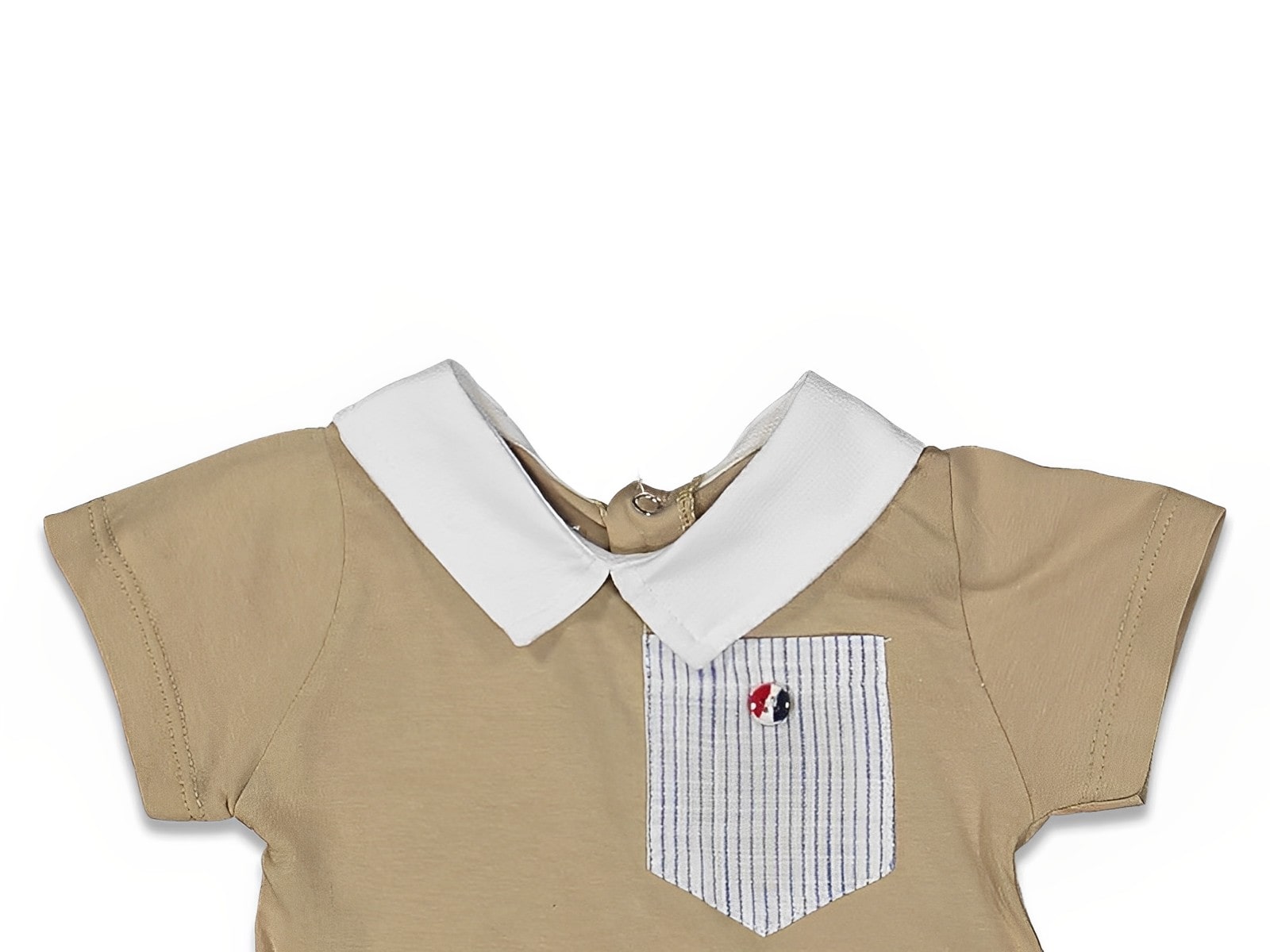 Κοντομάνικο φορμάκι εξόδου σε σχέδιο μπλουζίτσα με γιακαδάκι σε καφέ χρώμα, ενιαία με πουκαμισάκι όπου έχει τσεπούλα στo ύψος του στήθους. Στο κάτω μέρος το φορμάκι έχει σχέδιο άσπρο παντελονάκι, ενώ στο τελείωμά του έχει άνοιγμα με τρουκς για εύκολη αλλαγή πάνας.