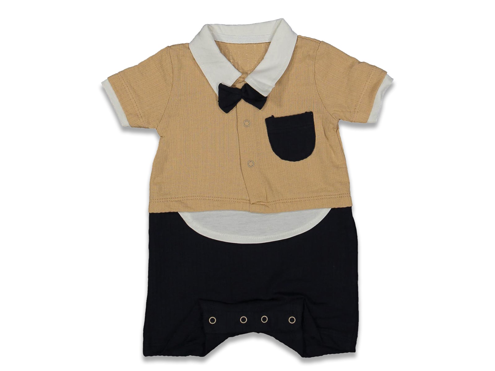 Κοντομάνικο φορμάκι εξόδου σε σχέδιο μπλουζίτσα με γιακαδάκι σε καφέ χρώμα, ενιαία με πουκαμισάκι όπου έχει τσεπούλα στ ύψος του στήθους και κολλημένο σκούρο μπλε παπιγιόν. Στο κάτω μέρος το φορμάκι έχει σχέδιο σκούρο μπλε παντελονάκι, ενώ στο τελείωμά του έχει άνοιγμα με τρουκς για εύκολη αλλαγή πάνας.