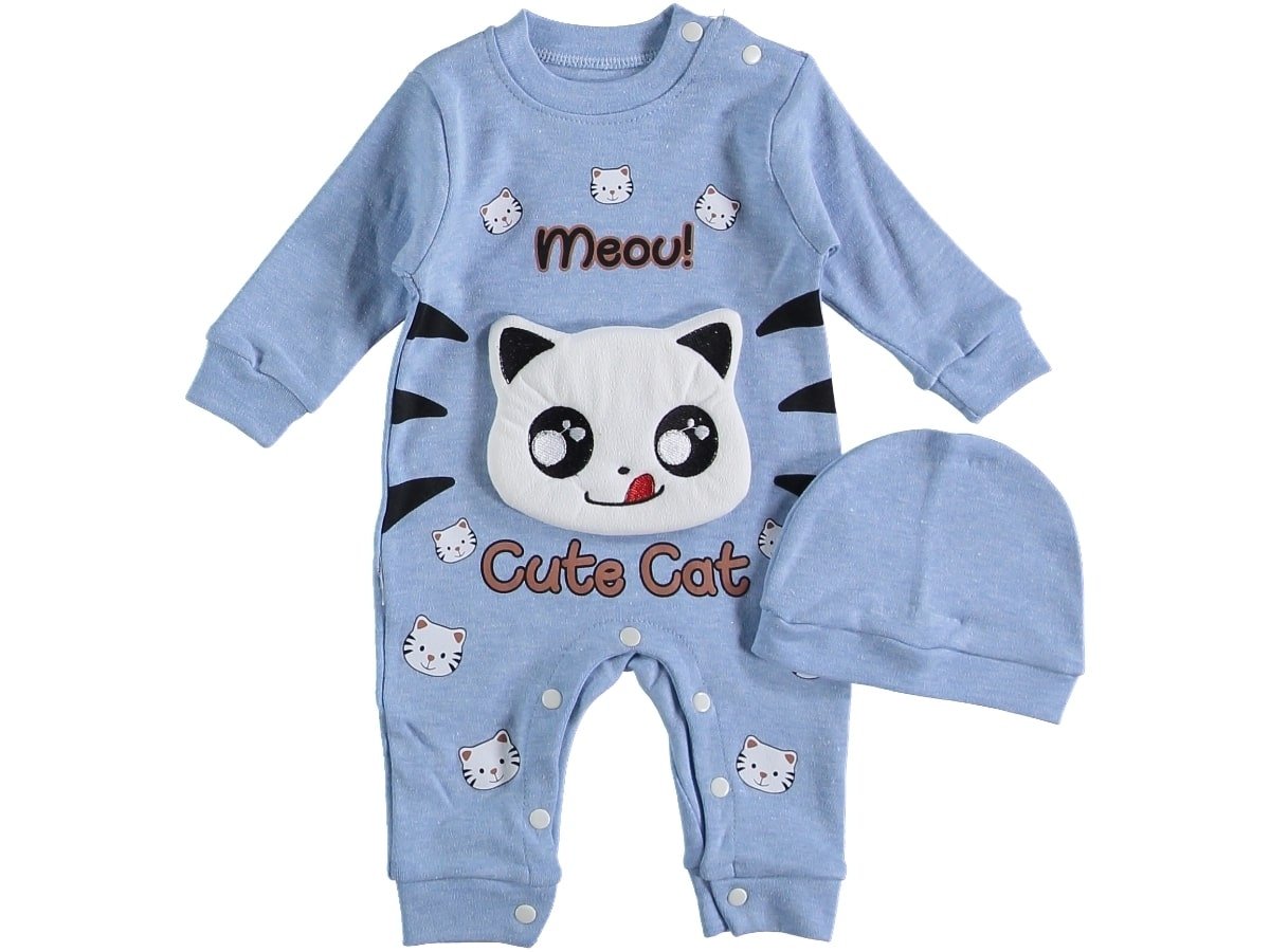 Φορμάκι με σχέδιο 3D γατούλα και γράφει “Meou! Cute Cat” σε γαλαζιο χρώμα, όπως και το σκουφάκι. Στο τελείωμά του το φορμάκι έχει ανοιχτά ποδαράκια και άνοιγμα με τρουκς στο κάτω μέρος, για εύκολη αλλαγή πάνας.