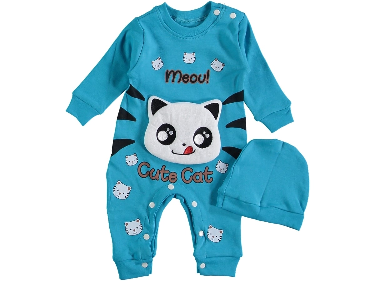 Φορμάκι με σχέδιο 3D γατούλα και γράφει “Meou! Cute Cat” σε οινοπνευματί χρώμα, όπως και το σκουφάκι. Στο τελείωμά του το φορμάκι έχει ανοιχτά ποδαράκια και άνοιγμα με τρουκς στο κάτω μέρος, για εύκολη αλλαγή πάνας.