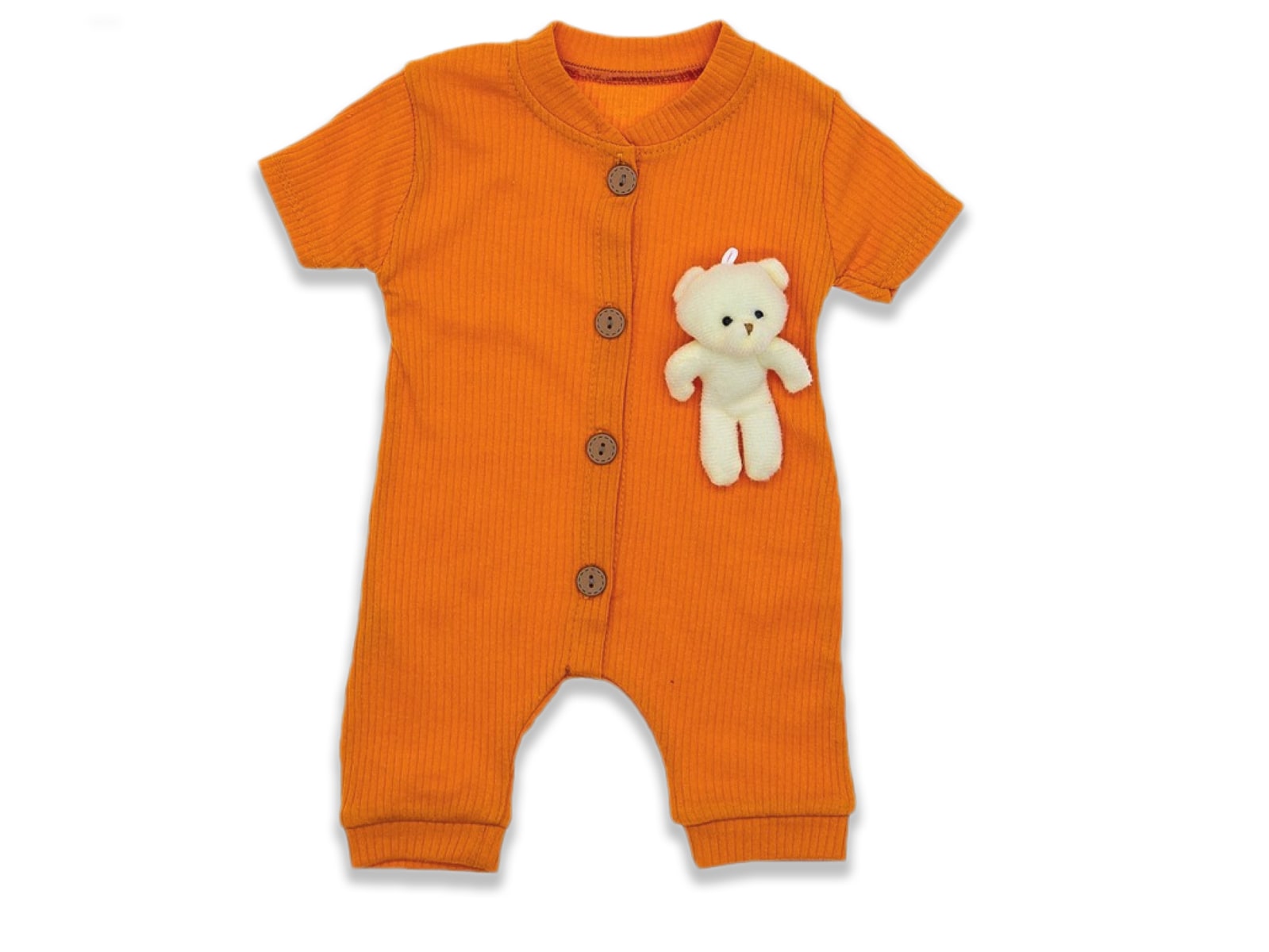 Φορμάκι κοντομάνικο σε πορτοκαλί χρώμα με αποσπόμενο 3D αρκοδάκι. Στο τελείωμά του το φορμάκι έχει ανοιχτά ποδαράκια και άνοιγμα με τρουκς στο κάτω μέρος, για εύκολη αλλαγή πάνας.