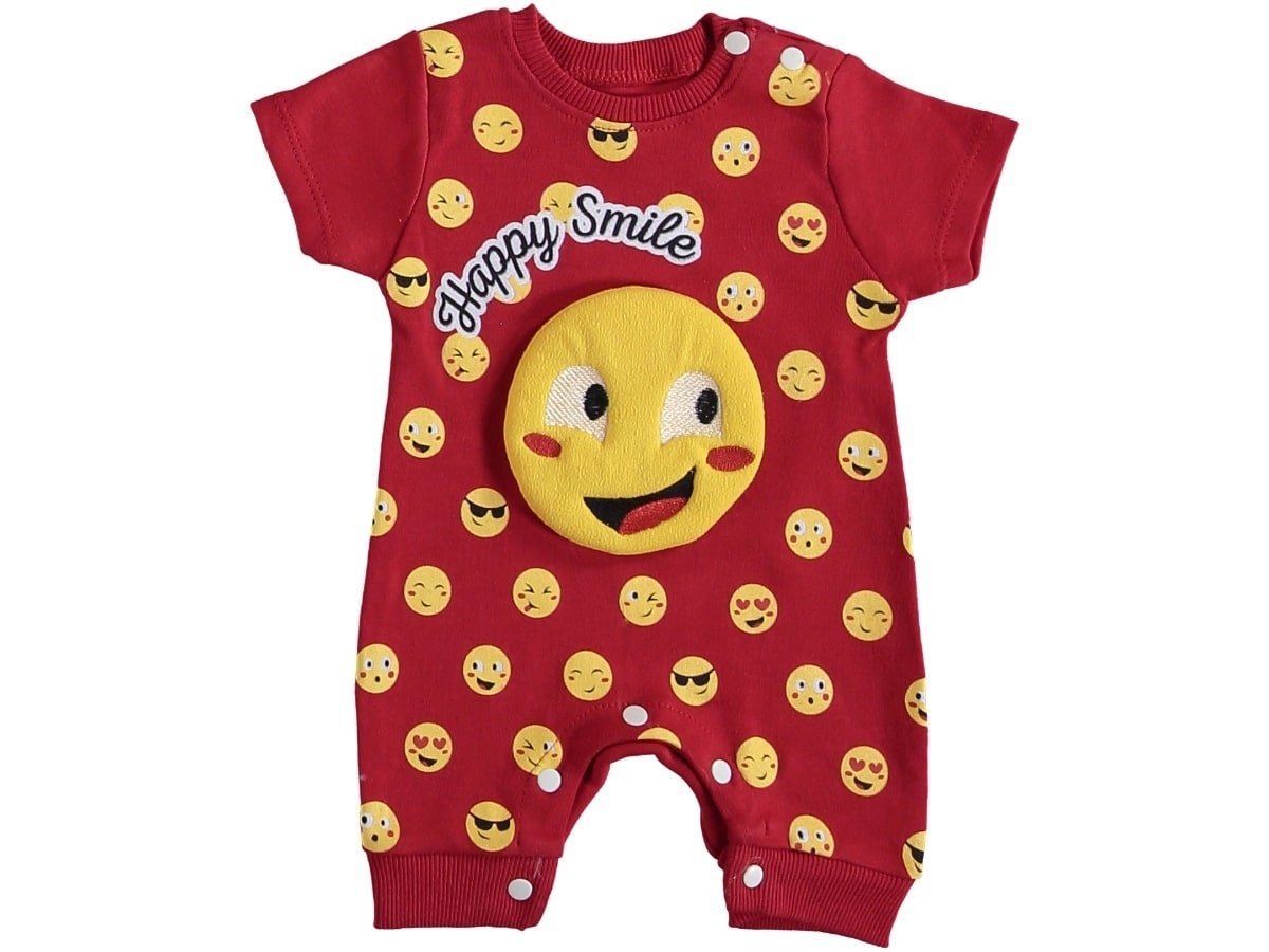 Φορμάκι κοντομάνικο σε κόκκινο χρώμα με σχέδιο 3D emoji. Στο τελείωμά του το φορμάκι έχει ανοιχτά ποδαράκια και άνοιγμα με τρουκς στο κάτω μέρος, για εύκολη αλλαγή πάνας.