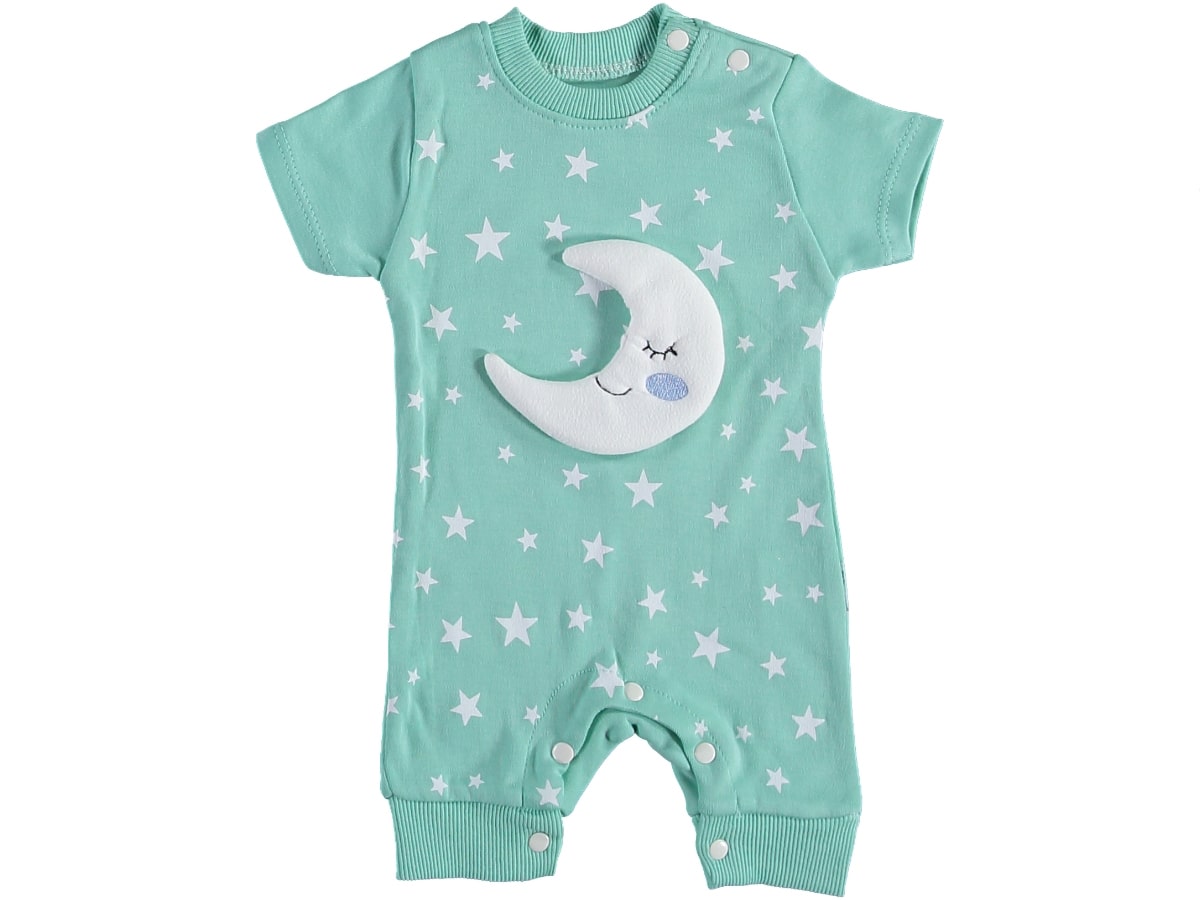Φορμάκι κοντομάνικο σε βεραμάν χρώμα με σχέδιο 3D φεγγαράκι και αστεράκια. Στο τελείωμά του το φορμάκι έχει ανοιχτά ποδαράκια και άνοιγμα με τρουκς στο κάτω μέρος, για εύκολη αλλαγή πάνας.