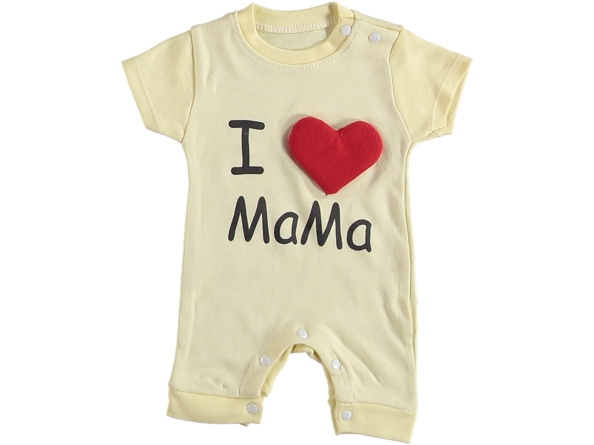Φορμάκι κοντομάνικο σε κίτρινο χρώμα με σχέδιο 3D καρδούλα και γράφει “I Love Mama”. Στο τελείωμά του το φορμάκι έχει ανοιχτά ποδαράκια και άνοιγμα με τρουκς στο κάτω μέρος, για εύκολη αλλαγή πάνας.