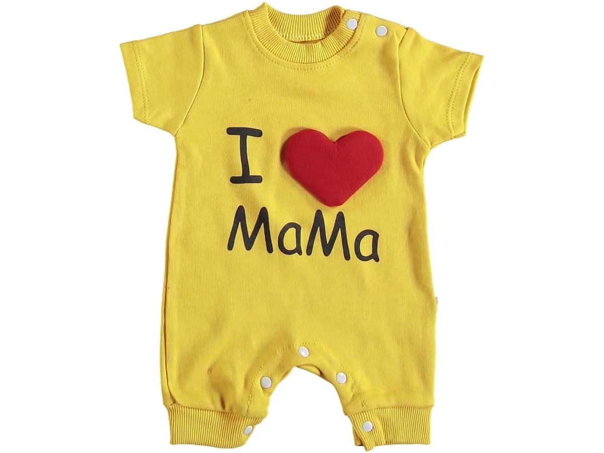 Φορμάκι κοντομάνικο σε μουσταρδί χρώμα με σχέδιο 3D καρδούλα και γράφει “I Love Mama”. Στο τελείωμά του το φορμάκι έχει ανοιχτά ποδαράκια και άνοιγμα με τρουκς στο κάτω μέρος, για εύκολη αλλαγή πάνας.