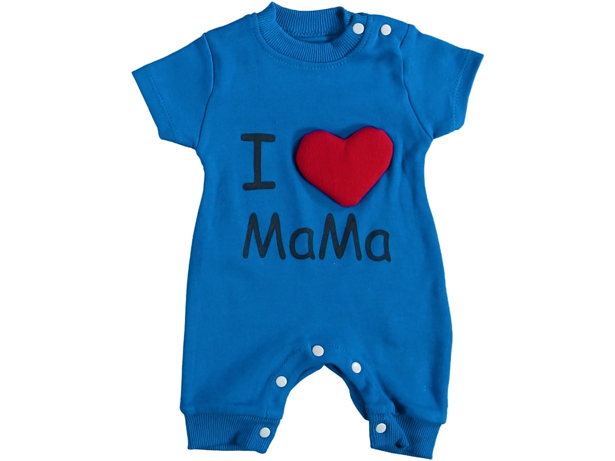 Φορμάκι κοντομάνικο σε μπλε χρώμα με σχέδιο 3D καρδούλα και γράφει “I Love Mama”. Στο τελείωμά του το φορμάκι έχει ανοιχτά ποδαράκια και άνοιγμα με τρουκς στο κάτω μέρος, για εύκολη αλλαγή πάνας.