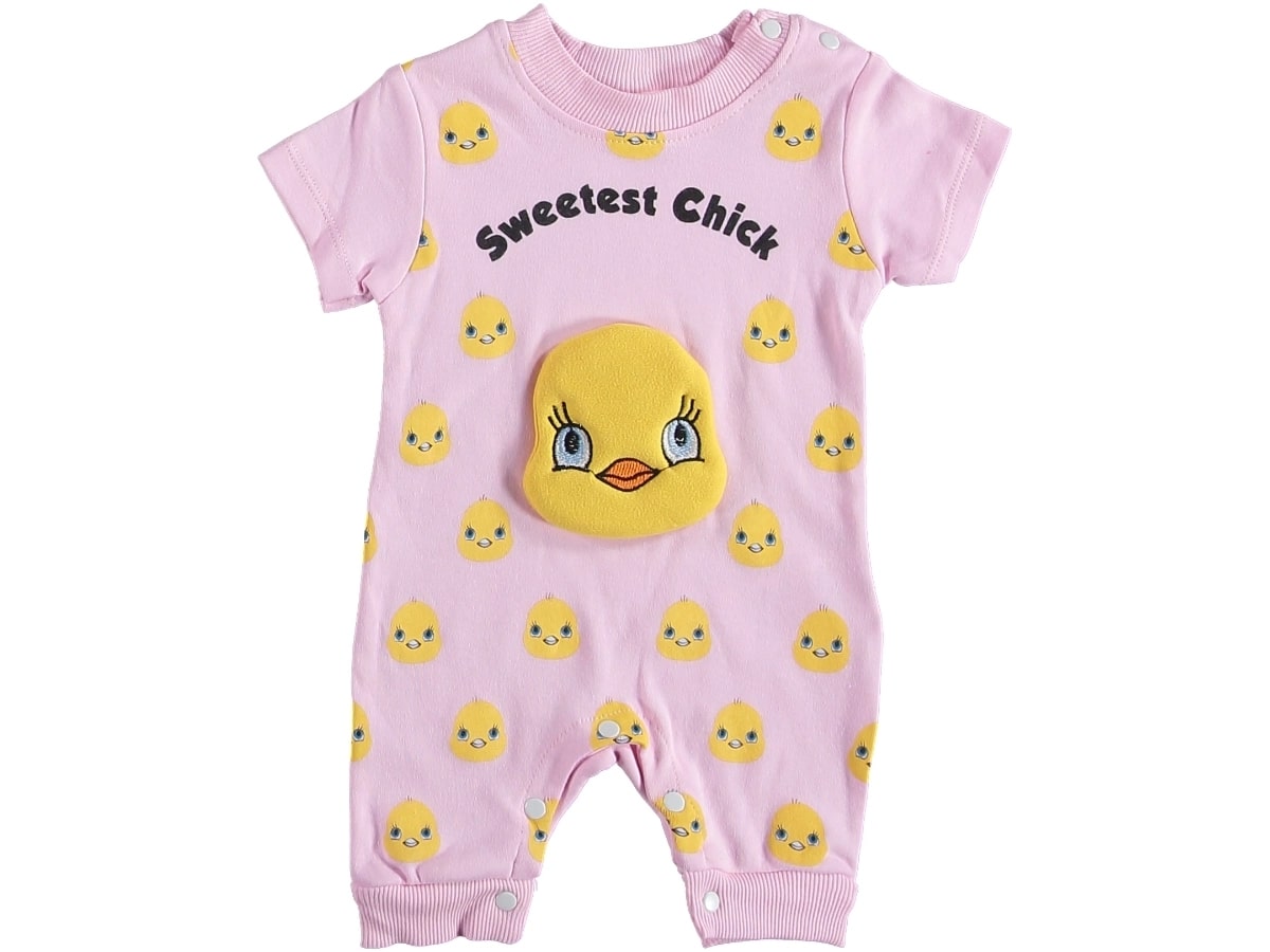 Φορμάκι κοντομάνικο σε ροζ χρώμα με σχέδιο 3D κοτοπουλάκι και γράφει “Sweetest Chick”. Στο τελείωμά του το φορμάκι έχει ανοιχτά ποδαράκια και άνοιγμα με τρουκς στο κάτω μέρος, για εύκολη αλλαγή πάνας.