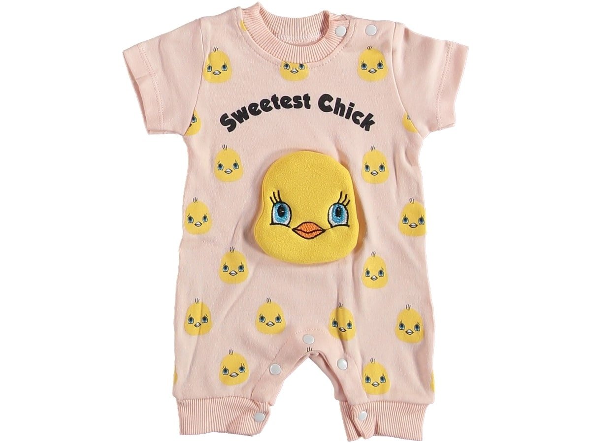 Φορμάκι κοντομάνικο σε σομόν χρώμα με σχέδιο 3D κοτοπουλάκι και γράφει “Sweetest Chick”. Στο τελείωμά του το φορμάκι έχει ανοιχτά ποδαράκια και άνοιγμα με τρουκς στο κάτω μέρος, για εύκολη αλλαγή πάνας.
