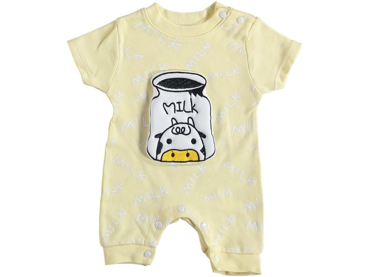 Φορμάκι κοντομάνικο σε κίτρινο χρώμα με σχέδιο 3D μπουκάλι γάλα με αγελαδίτσα και γράφει “Milk”. Στο τελείωμά του το φορμάκι έχει ανοιχτά ποδαράκια και άνοιγμα με τρουκς στο κάτω μέρος, για εύκολη αλλαγή πάνας.