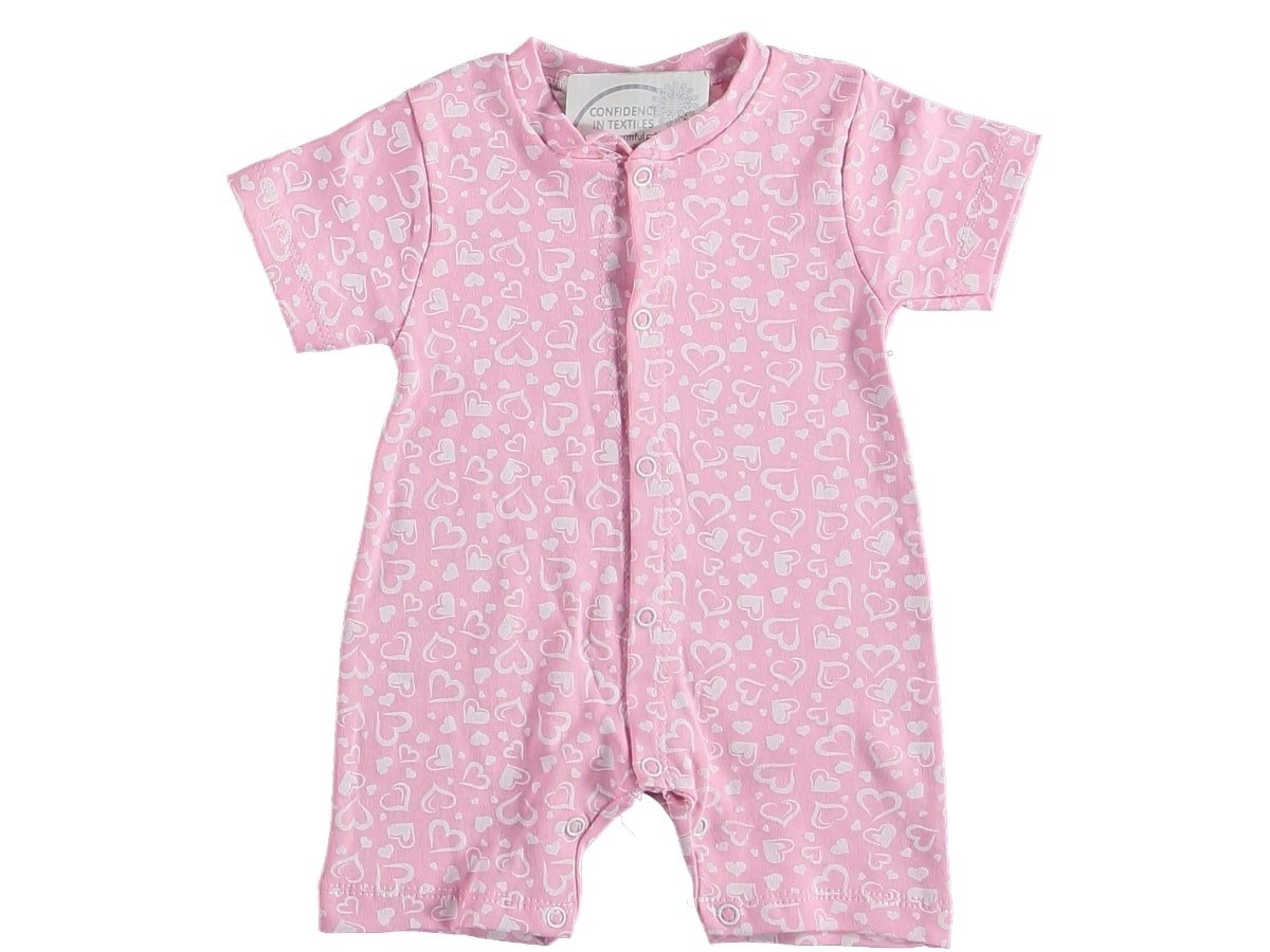 Κοντομάνικο καλοκαιρινό με σχέδιο καρδούλες σε ροζ χρώμα. Στο τελείωμά του το φορμάκι έχει και ανοιχτά ποδαράκια.