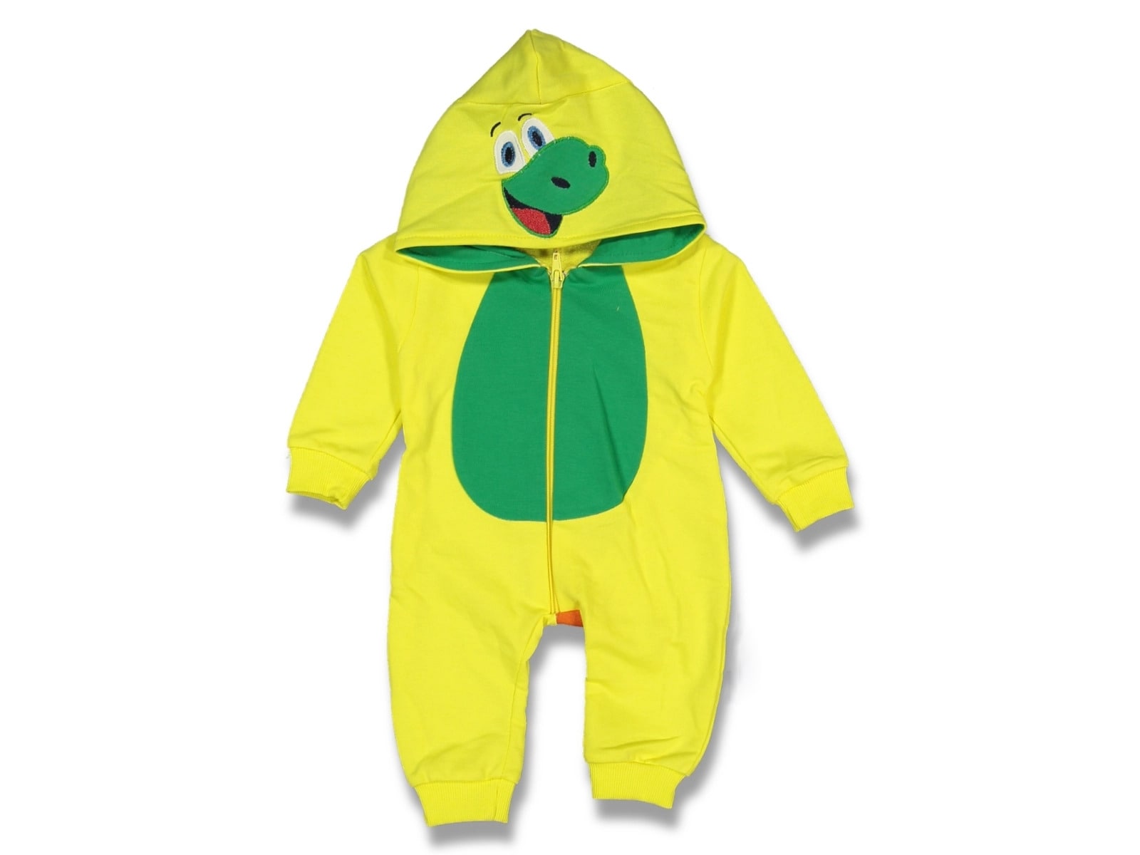 Φορμάκι με κουκούλα σε σχέδιο δεινοσαυράκι σε κίτρινο χρώμα. Η κουκούλα έχει απλικέ φατσούλα δεινοσαύρου και 3D πτερύγια στο πίσω μέρος. Το φορμάκι έχει άνοιγμα με φερμουάρ.