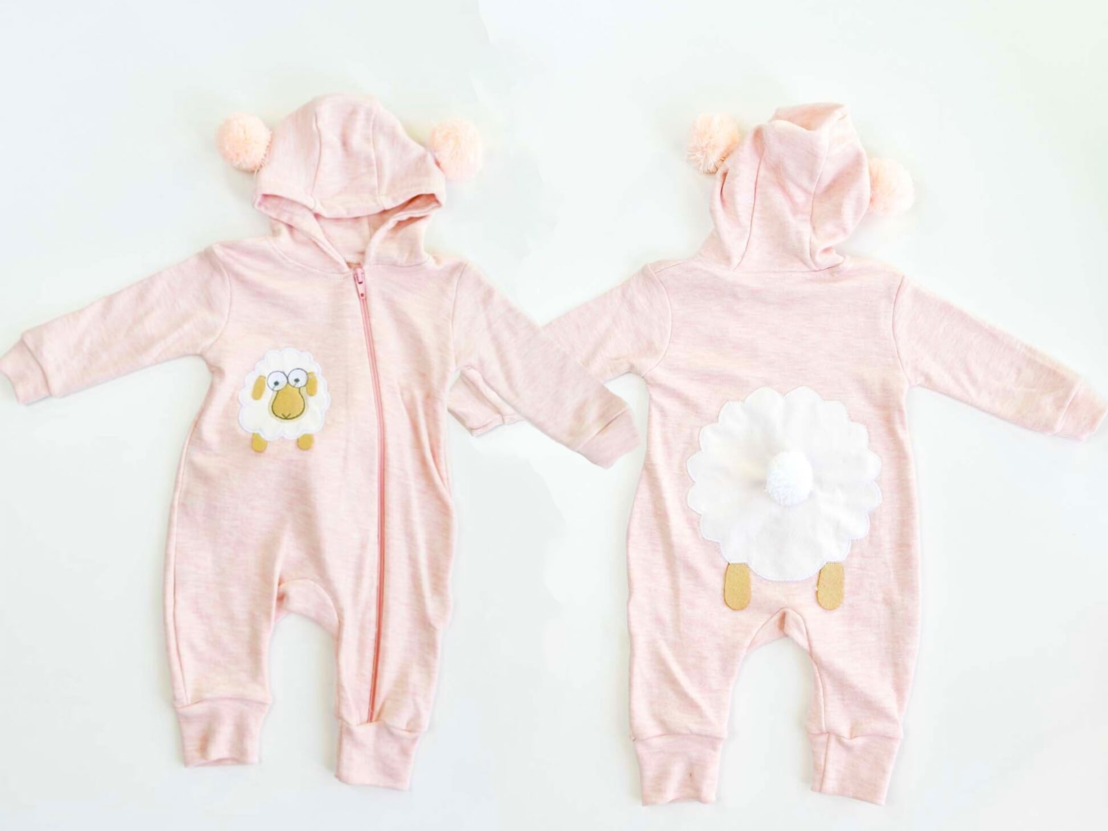 Φορμάκι με κουκούλα και αποσπώμενα αυτάκια με velcro σε σχέδιο προβατάκι με ουρίτσα 3D στο πίσω μέρος σε σομόν χρώμα. Το φορμάκι έχει άνοιγμα με φερμουάρ.