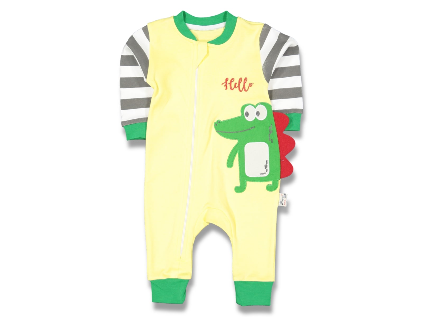 Φορμάκι σε κίτρινο χρώμα, με ρίγες και σχέδιο απλικέ δεινοσαυράκι και γράφει “Hello”. Το φορμάκι έχει άνοιγμα με φερμουάρ και ανοιχτά ποδαράκια.