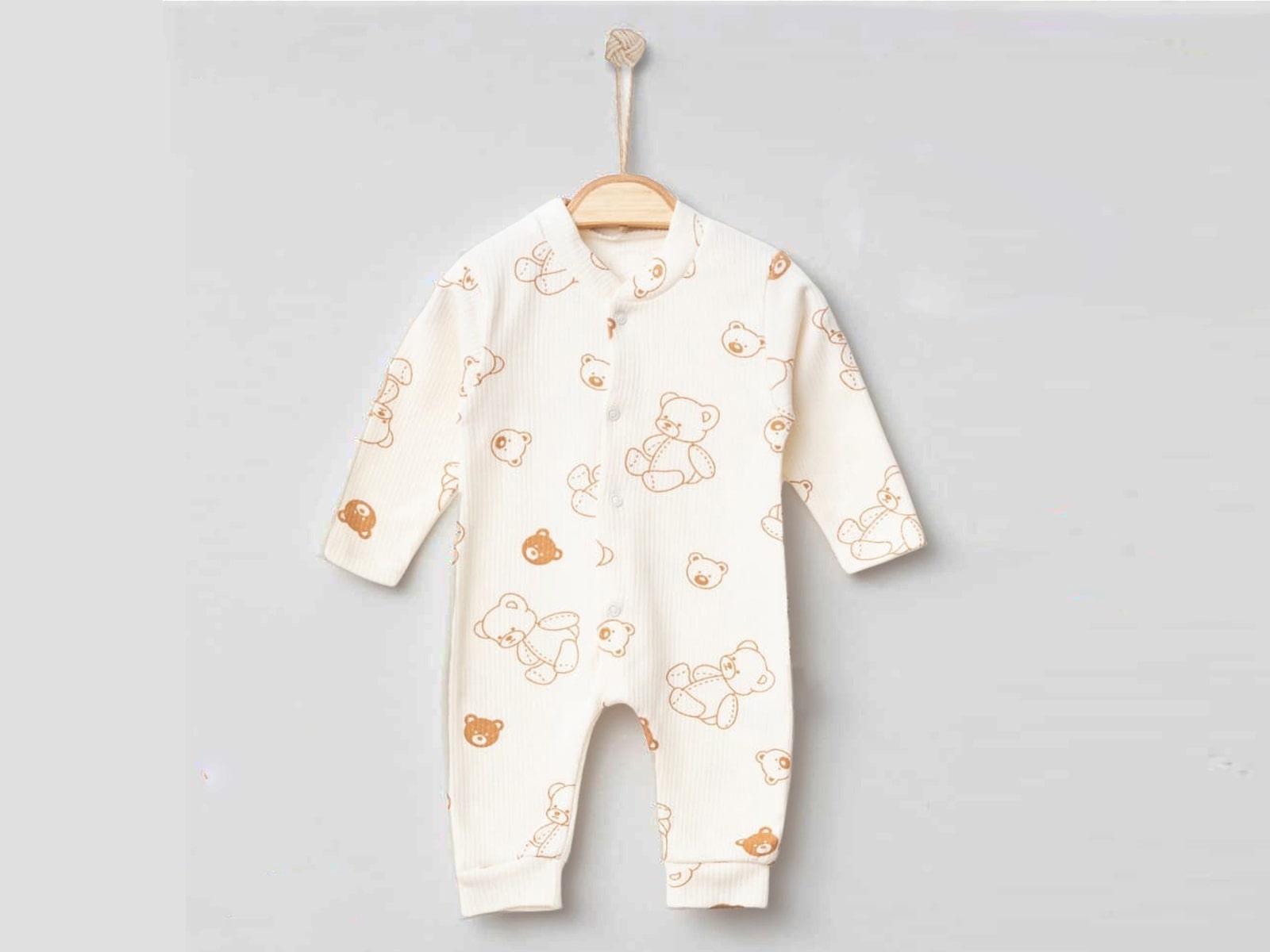 Βρεφικό φορμάκι σε μπεζ χρώμα με σχέδιο αρκουδάκια και άνοιγμα τρουκς ( κόπιτσες ). Στο τελείωμά του το φορμάκι έχει ανοιχτά ποδαράκια.