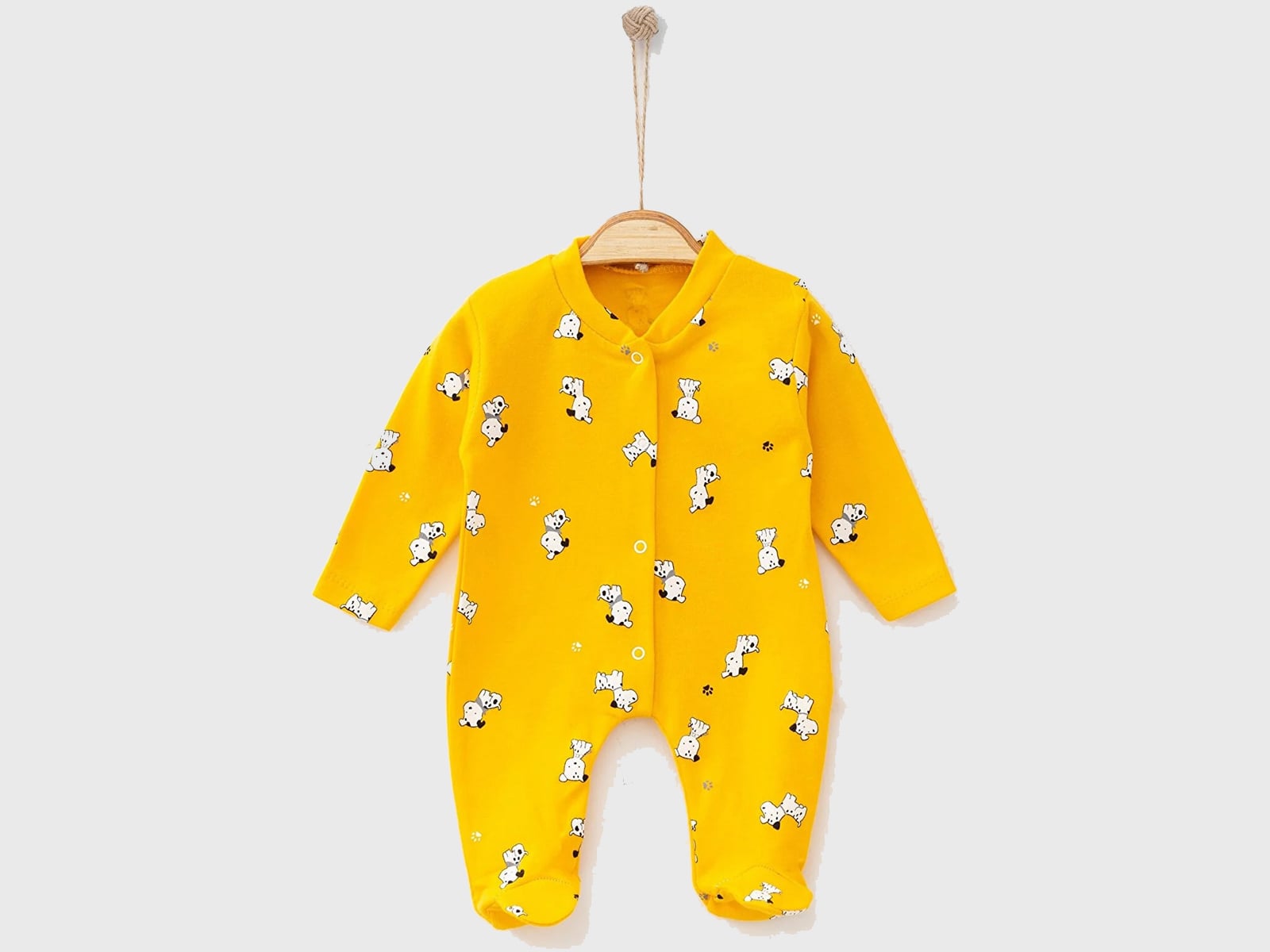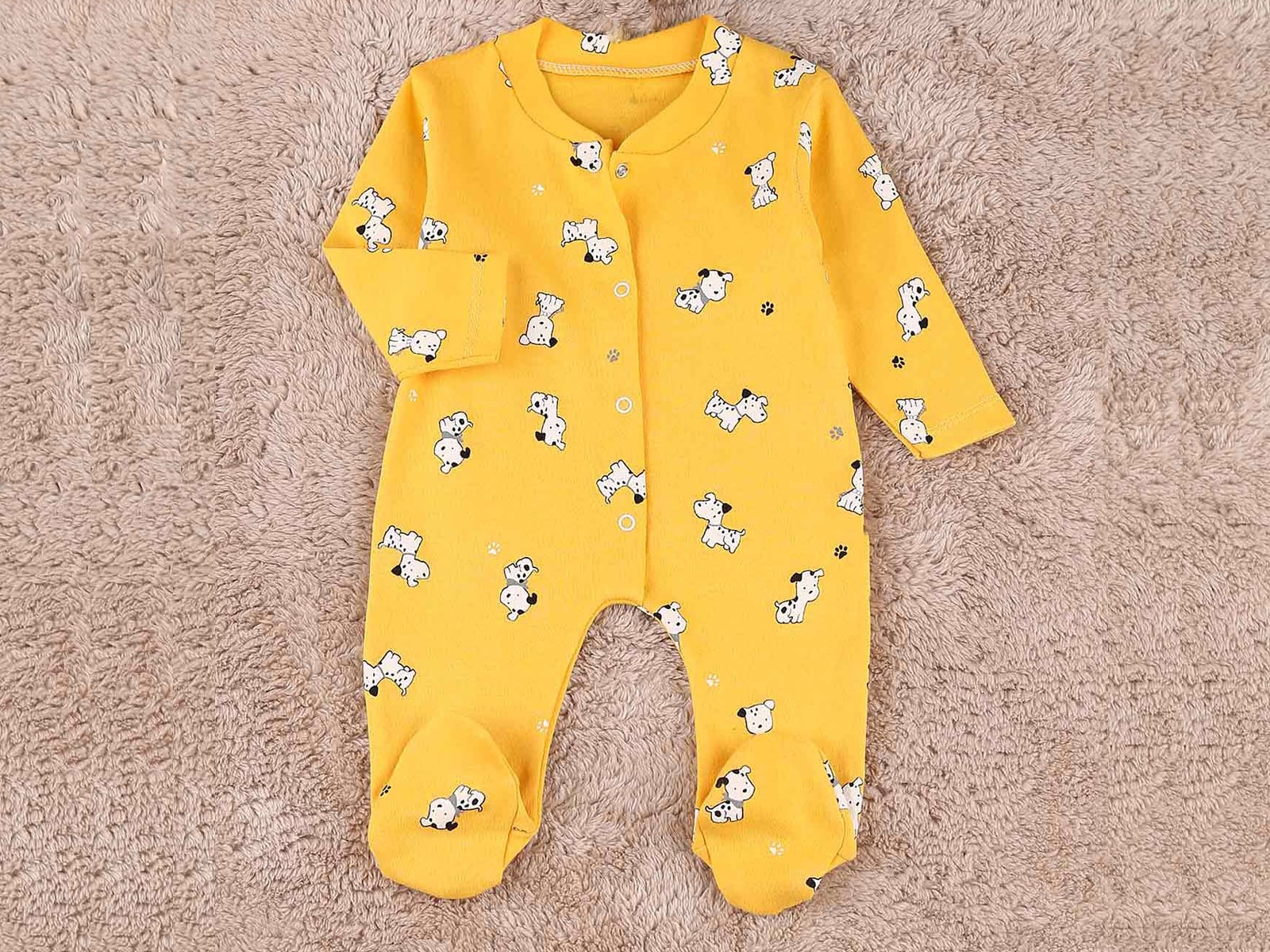 Βρεφικό φορμάκι σε κίτρινο χρώμα με σχέδιο ζωάκια σκυλάκια και άνοιγμα τρουκς ( κόπιτσες ). Στο τελείωμά του το φορμάκι έχει κλειστά ποδαράκια.