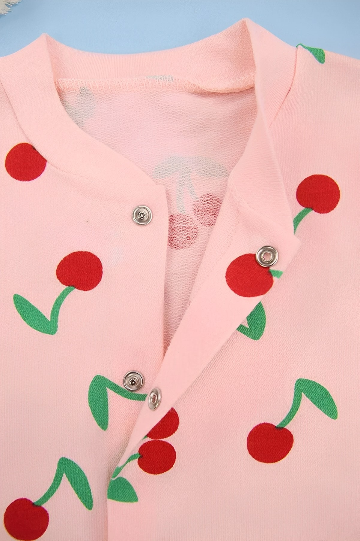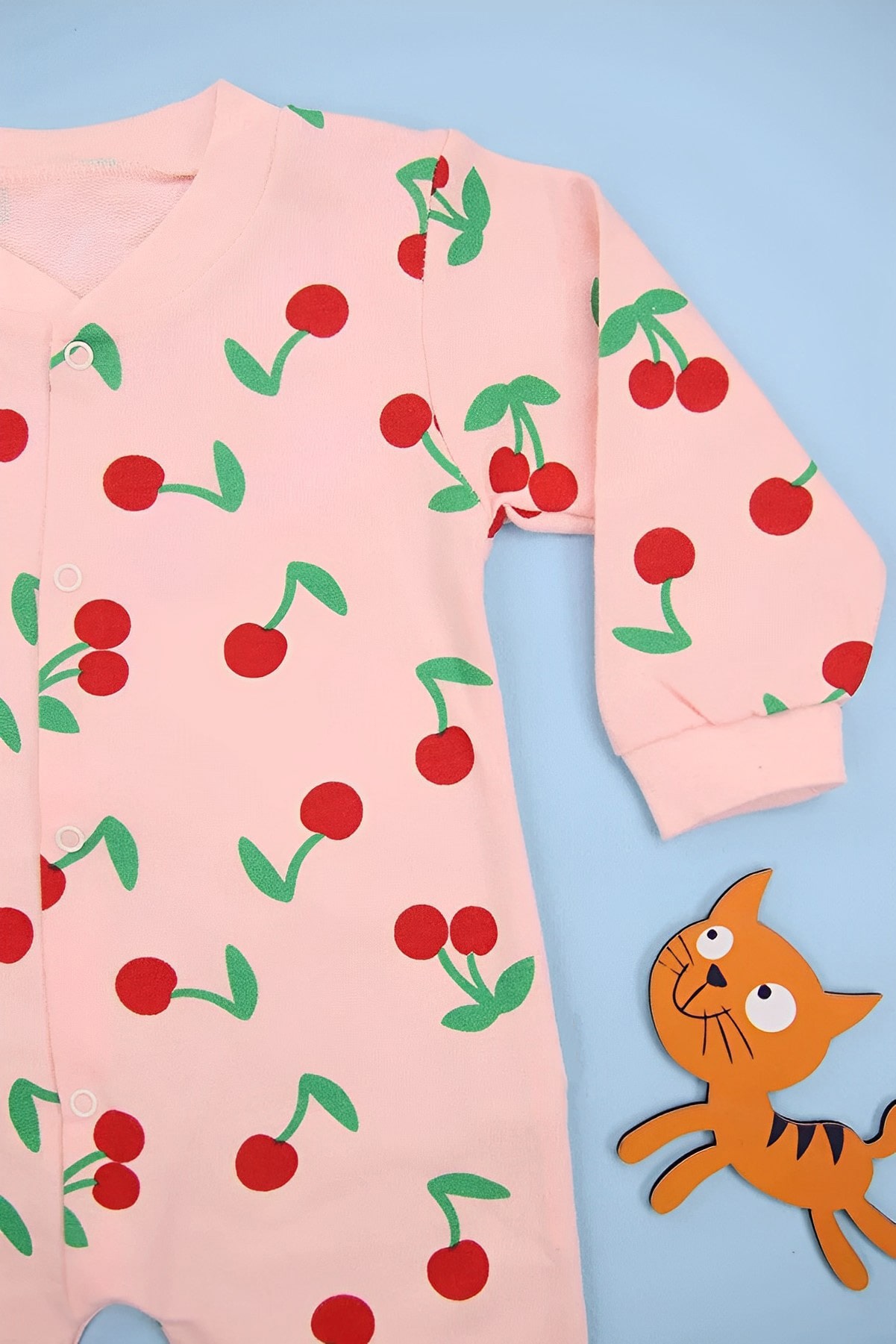 Βρεφικό φορμάκι σε σομόν χρώμα με σχέδιο κεράσια. Έχει άνοιγμα με τρουκς ( κόπιτσες ). Στο τελείωμά του το φορμάκι έχει ανοιχτά ποδαράκια.
