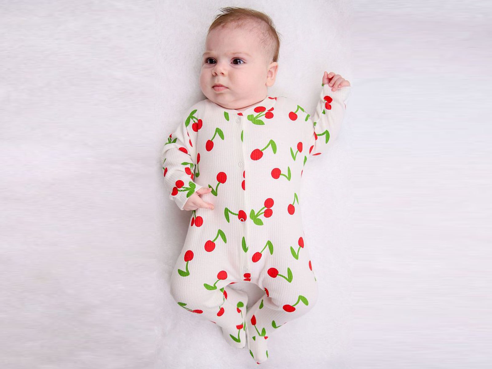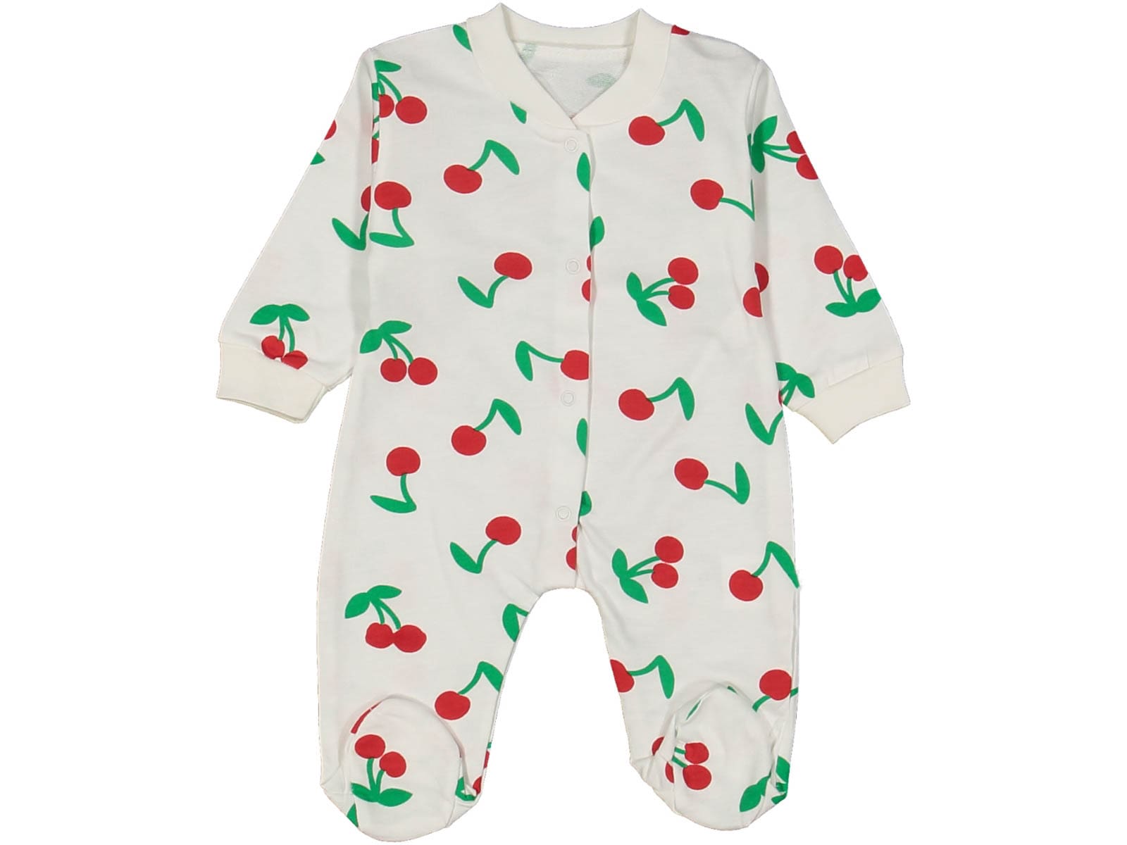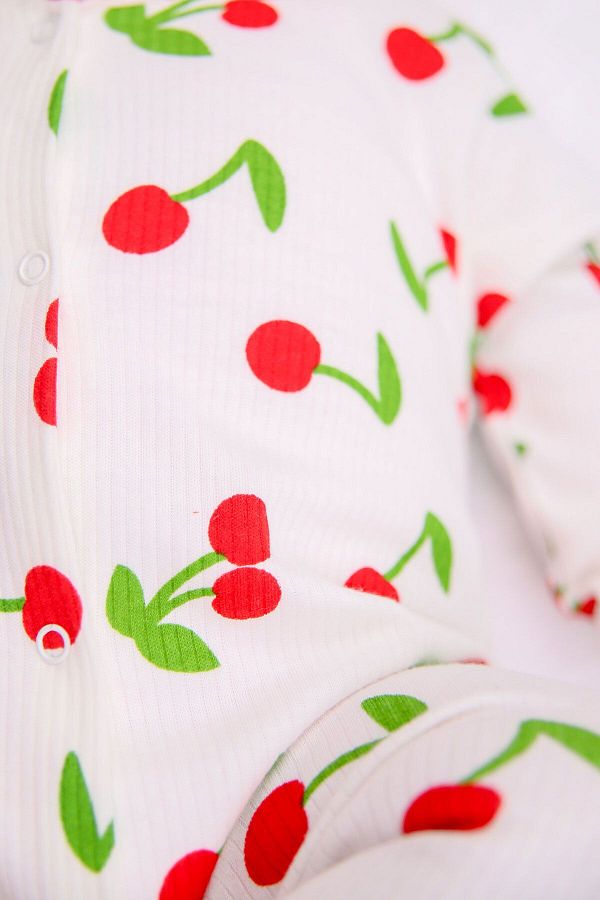 Βρεφικό φορμάκι σε άσπρο χρώμα με σχέδιο κεράσια. Έχει άνοιγμα με τρουκς ( κόπιτσες ). Στο τελείωμά του το φορμάκι έχει κλειστά ποδαράκια.