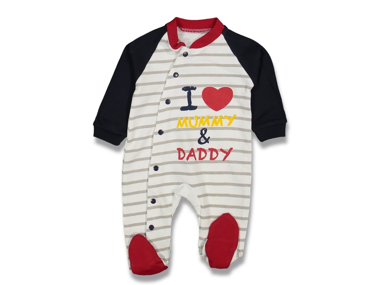 Φορμάκι με σχέδιο στάμπα ρίγες και γράφει “I Love Mommy & Daddy” σε σκούρο μπλε χρώμα. Στο τελείωμά του το φορμάκι έχει κλειστά ποδαράκια.