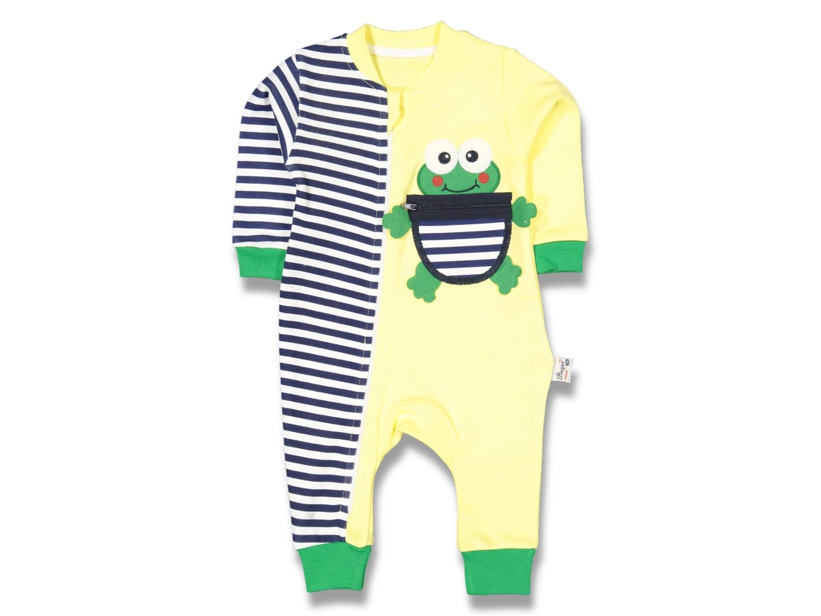 Φορμάκι σε κίτρινο χρώμα, με ρίγες και σχέδιο απλικέ βατραχάκι με ψεύτικη τσεπούλα. Το φορμάκι έχει άνοιγμα με φερμουάρ και ανοιχτά ποδαράκια.