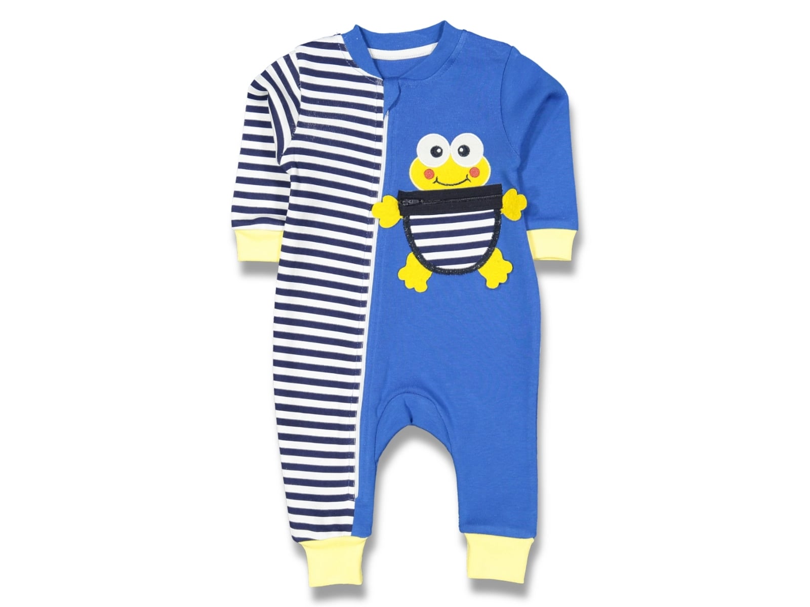 Φορμάκι σε μπλε χρώμα, με ρίγες και σχέδιο απλικέ βατραχάκι με ψεύτικη τσεπούλα. Το φορμάκι έχει άνοιγμα με φερμουάρ και ανοιχτά ποδαράκια.