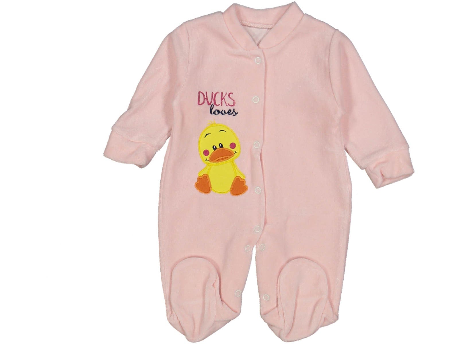 Φορμάκι σε ροζ χρώμα με σχέδιο παπάκι και σκουφάκι και γράφει “Ducks Lover” . Το φοράμκι έχει άνοιγμα με τρουκς και στο τελείωμά του έχει κλειστά ποδαράκια.