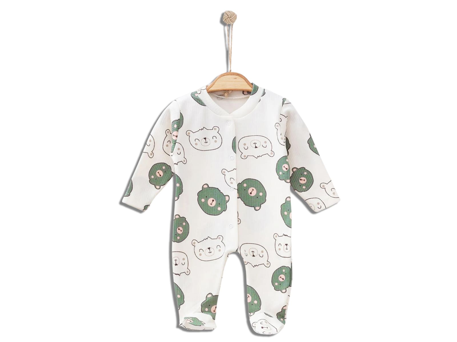 Βρεφικό φορμάκι σε μπεζ χρώμα με άνοιγμα τρουκς ( κόπιτσες ). Έχει σχέδιο πράσινα αρκουδάκια, ενώ στο τελείωμά του το φορμάκι έχει κλειστά ποδαράκια.