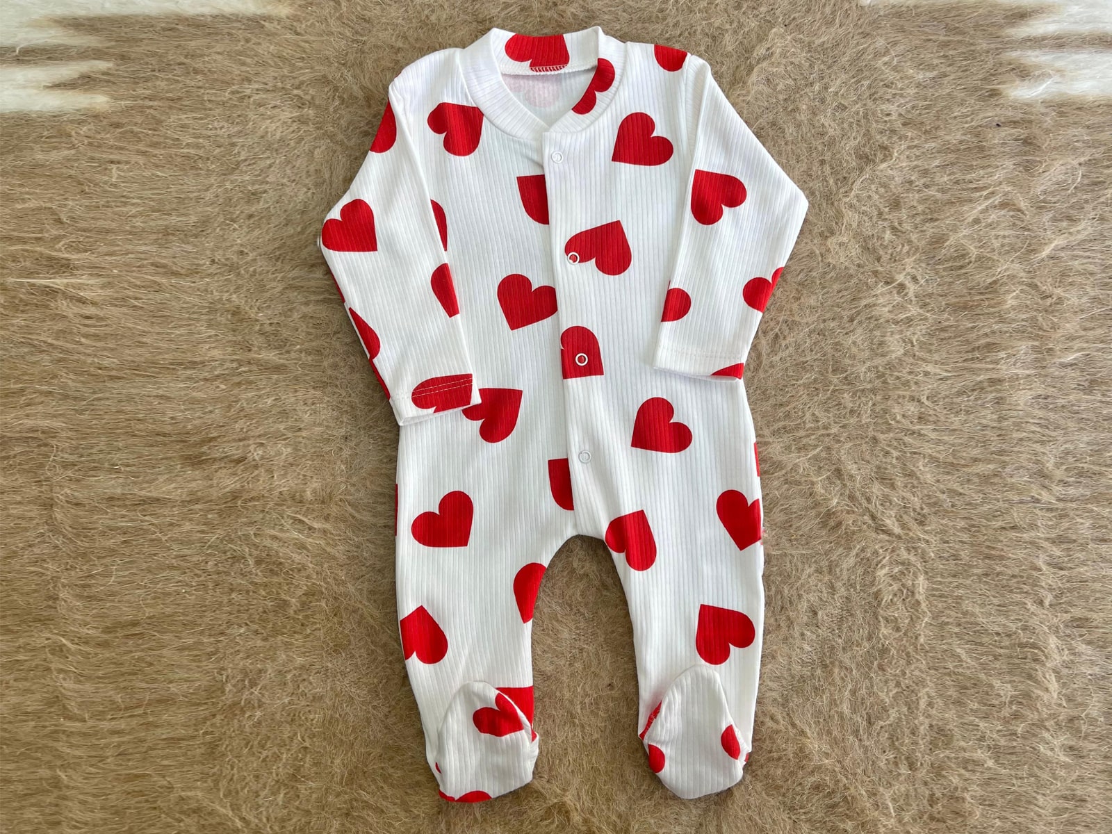 Βρεφικό φορμάκι σε κόκκινο χρώμα με σχέδιο καρδιές και άνοιγμα τρουκς ( κόπιτσες ). Στο τελείωμά του το φορμάκι έχει κλειστά ποδαράκια.