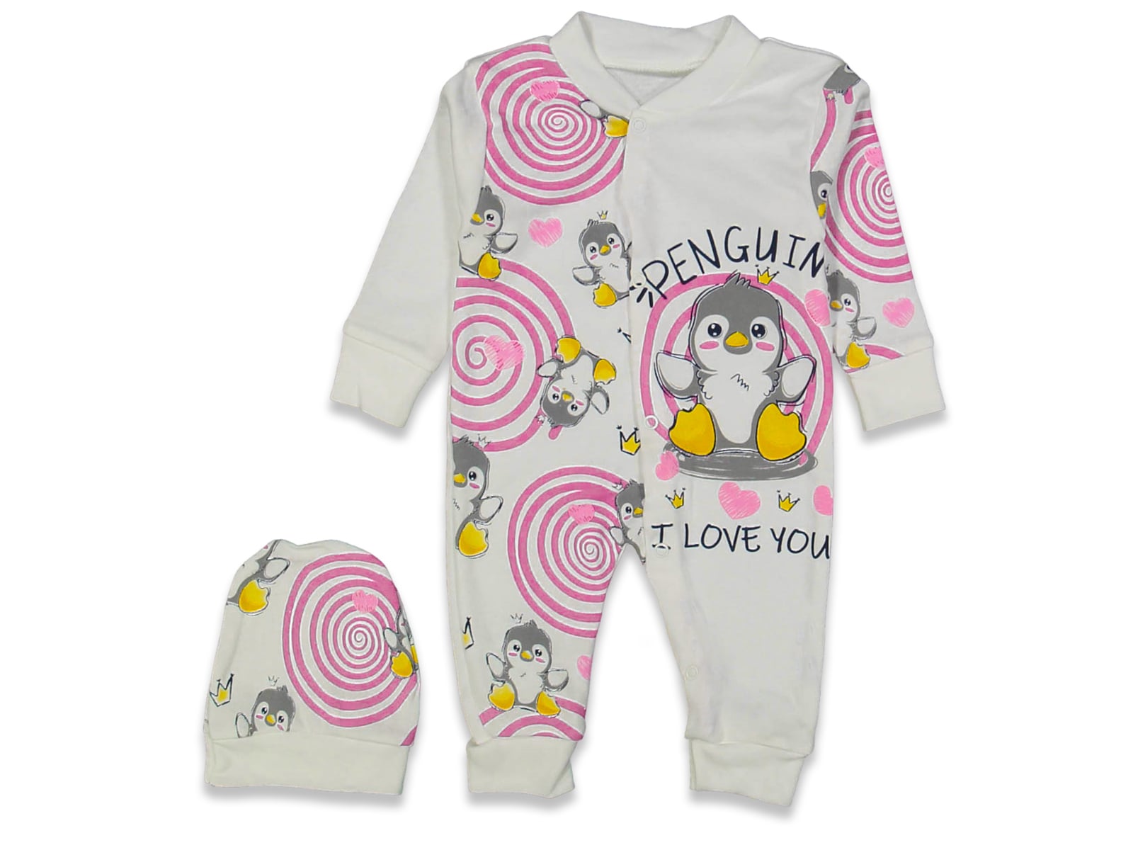 Βρεφικό φορμάκι σε άσπρο χρώμα με σχέδιο στάμπα πιγκουινάκια με ροζ κύκλους, όπως και το σκουφάκι, και γράφει “I Love You Penguin” ενώ έχει και άνοιγμα τρουκς ( κόπιτσες ). Στο τελείωμά του το φορμάκι έχει ανοιχτά ποδαράκια.