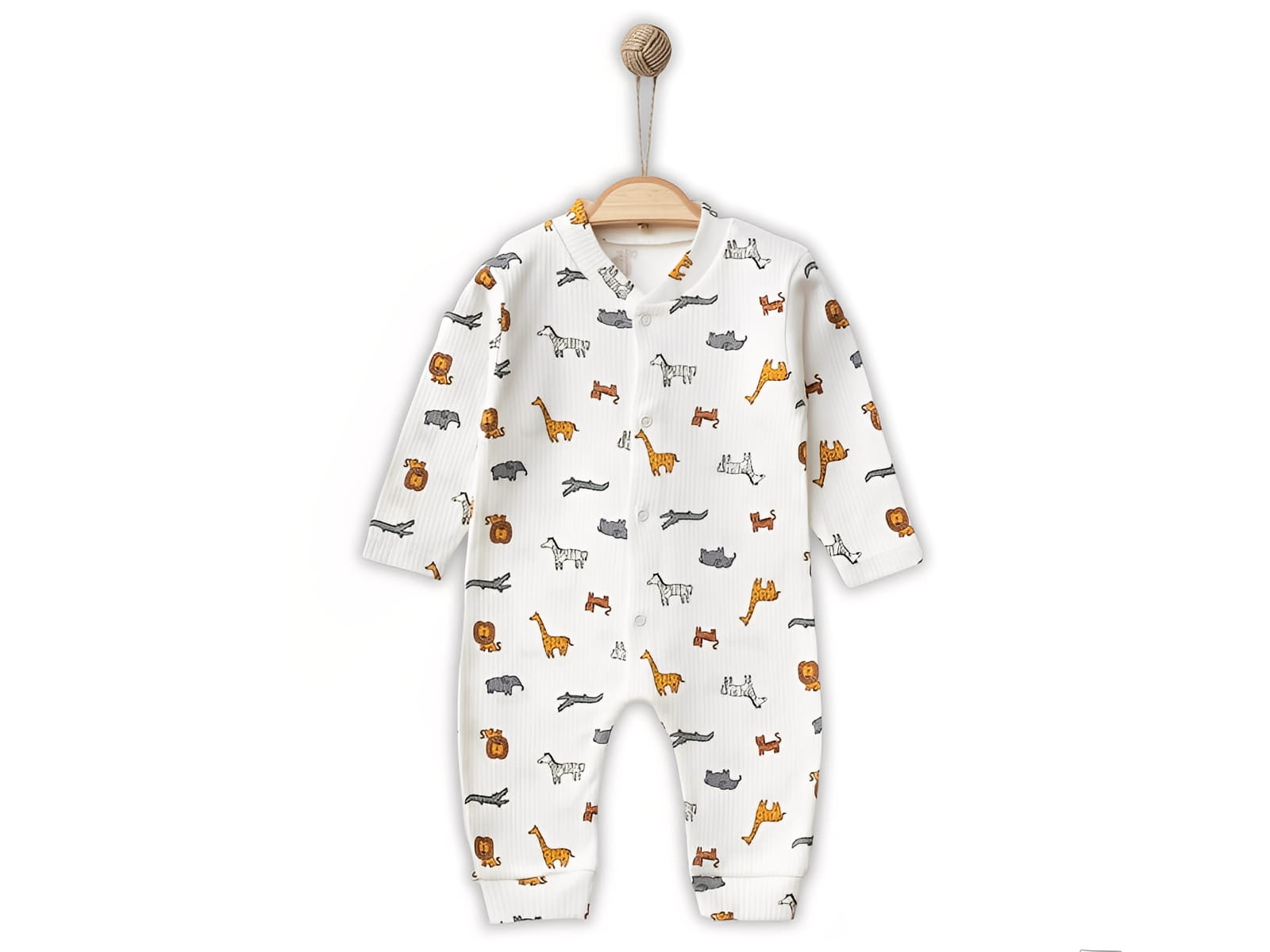 Βρεφικό φορμάκι σε λευκό χρώμα με άνοιγμα τρουκς ( κόπιτσες ). Έχει σχέδιο πολλά ζώα της ζούγκλας (λιοντάρι, ζέβρα, κροκόδειλος κλπ). Στο τελείωμά του το φορμάκι έχει ανοιχτά ποδαράκια.