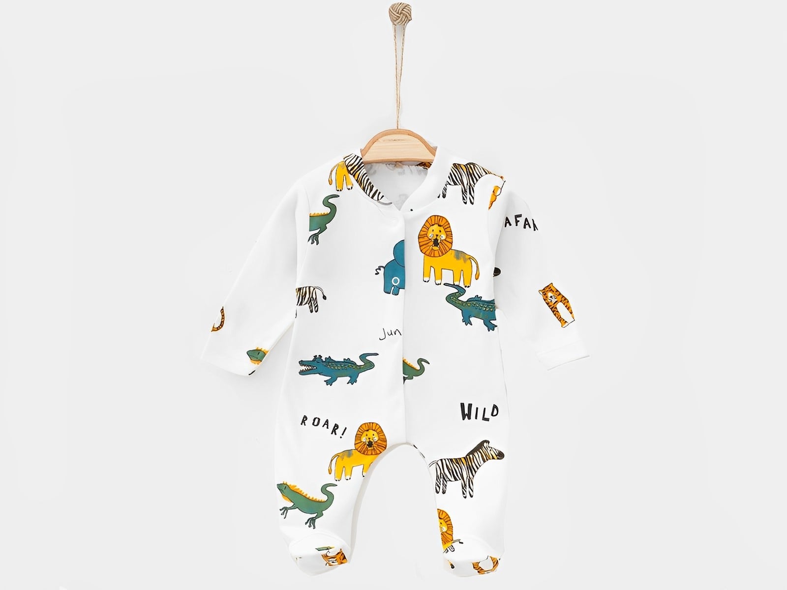 Βρεφικό φορμάκι σε λευκό χρώμα με άνοιγμα τρουκς ( κόπιτσες ). Έχει σχέδιο πολλά ζώα της ζούγκλας (λιοντάρι, ζέβρα, κροκόδειλος κλπ) και γράφει “Safari, Roar, Wild”. Στο τελείωμά του το φορμάκι έχει κλειστά ποδαράκια.