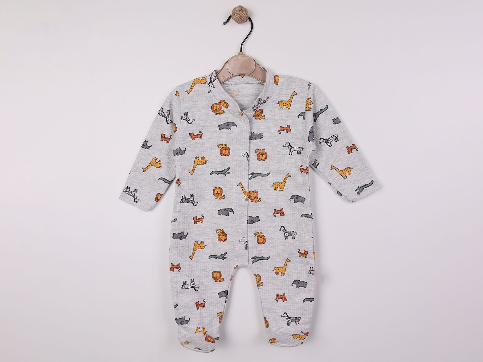 Βρεφικό φορμάκι σε γκρι χρώμα με άνοιγμα τρουκς ( κόπιτσες ). Έχει σχέδιο πολλά ζώα της ζούγκλας (λιοντάρι, ζέβρα, κροκόδειλος κλπ). Στο τελείωμά του το φορμάκι έχει κλειστά ποδαράκια.