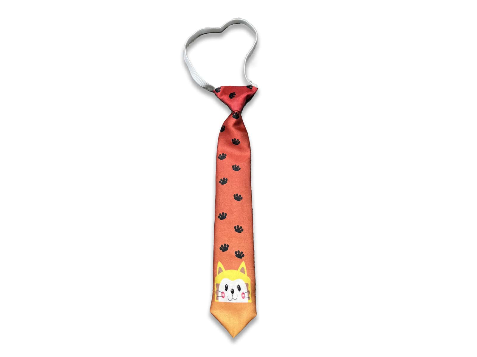 Γραβατα από σατέν ύφασμα με λάστιχο για τέλεια εφαρμογή όπου έχει σχέδιο γατούλα και πατουσίτσες και είναι σε πορτοκαλί χρώμα . Διαστάσεις 25 x 5 εκατοστά περίπου.