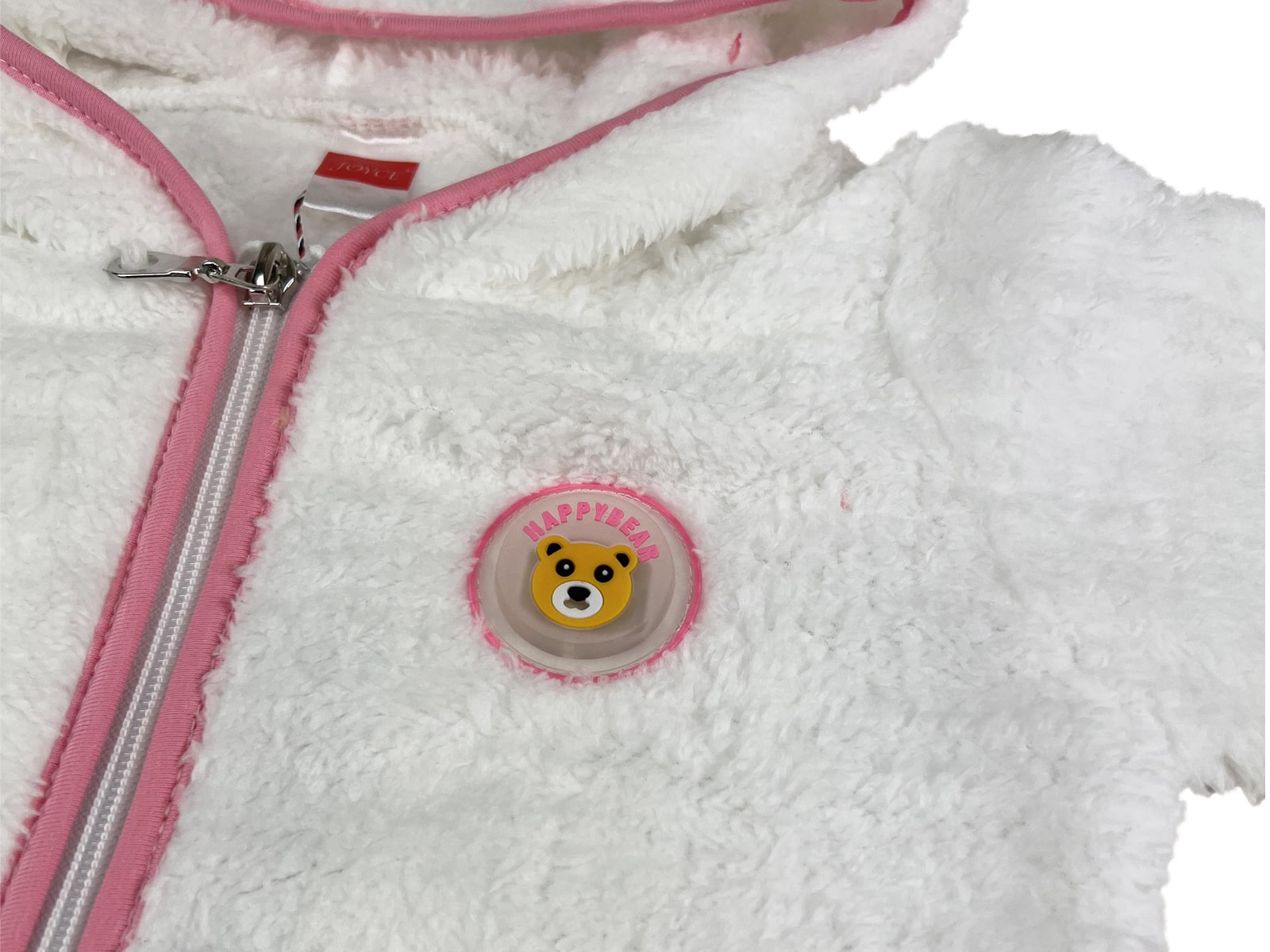 Γούνινο φλις ( fleece ) ζακετάκι από την εταιρία Joyce το έχει οποίο κουκούλα με αυτάκια και άνοιγμα με φερμουάρ. Έχει σχέδιο αρκουδάκι και γράφει “Happy Bear”. Τέλος η ζακέτα είναι σε άσπρο χρώμα.