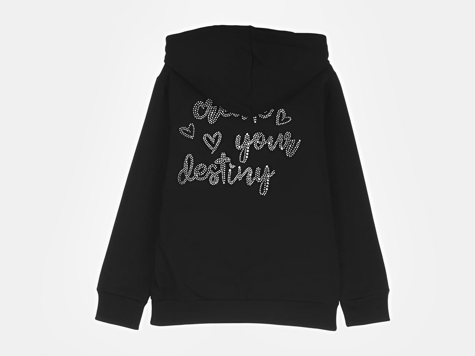 Παιδικό σετάκι για κοριτσάκια με εσωτερική επένδυση χνούδι φλις (fleece) από την εταιρία Joyce που αποτελείται από μπλουζίτσα και παντελονάκι. Η μπλούζα είναι σε μαύρο χρώμα με κουκούλα και γράφει στο πίσω μέρος με στρασάκια “Meet Your Destiny”. Το παντελόνι είναι μονόχρωμο μαύρο και έχει λάστιχο περιμετρικά στη μέση και στους αστραγάλους. Είναι ιδανικές για να προσφέρουν άνεση καθημερινότητα και στο σχολείο!