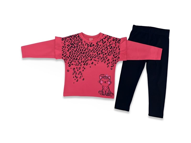 Το σετ αυτό αποτελείται από παιδική μπλούζα και παντελόνι κολάν τα οποία είναι από την εταιρία Joyce. Η μπλούζα είναι σε κοραλί χρώμα η οποία στα μανίκια έχει βολάν και άνιμαλ πριντ σχέδιο γατούλα. Το παντελόνι είναι κολάν σε μαύρο χρώμα το οποίο έχει λάστιχο περιμετρικά στη μέση.