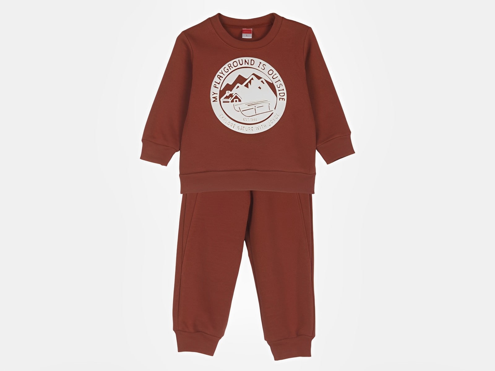 Το σετ αποτελείται από παιδική μπλούζα και παντελόνι και είναι χειμερινό, με εσωτερική επένδυση χνούδι φλις (fleece), από την εταιρία Joyce. Η μπλούζα είναι σε κεραμιδί χρώμα και έχει σχέδιο στάμπα που γράφει “Playground Is Outside”. Το παντελόνι είναι σε κεραμιδί χρώμα και έχει λάστιχο περιμετρικά στη μέση και στο κάτω μέρος.