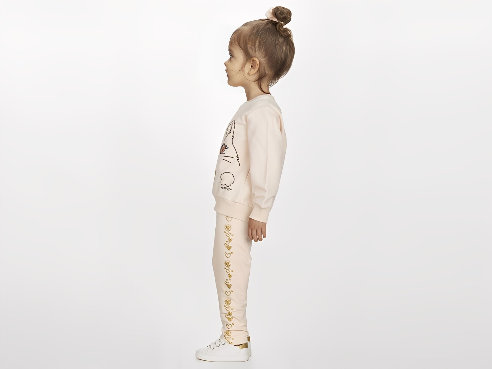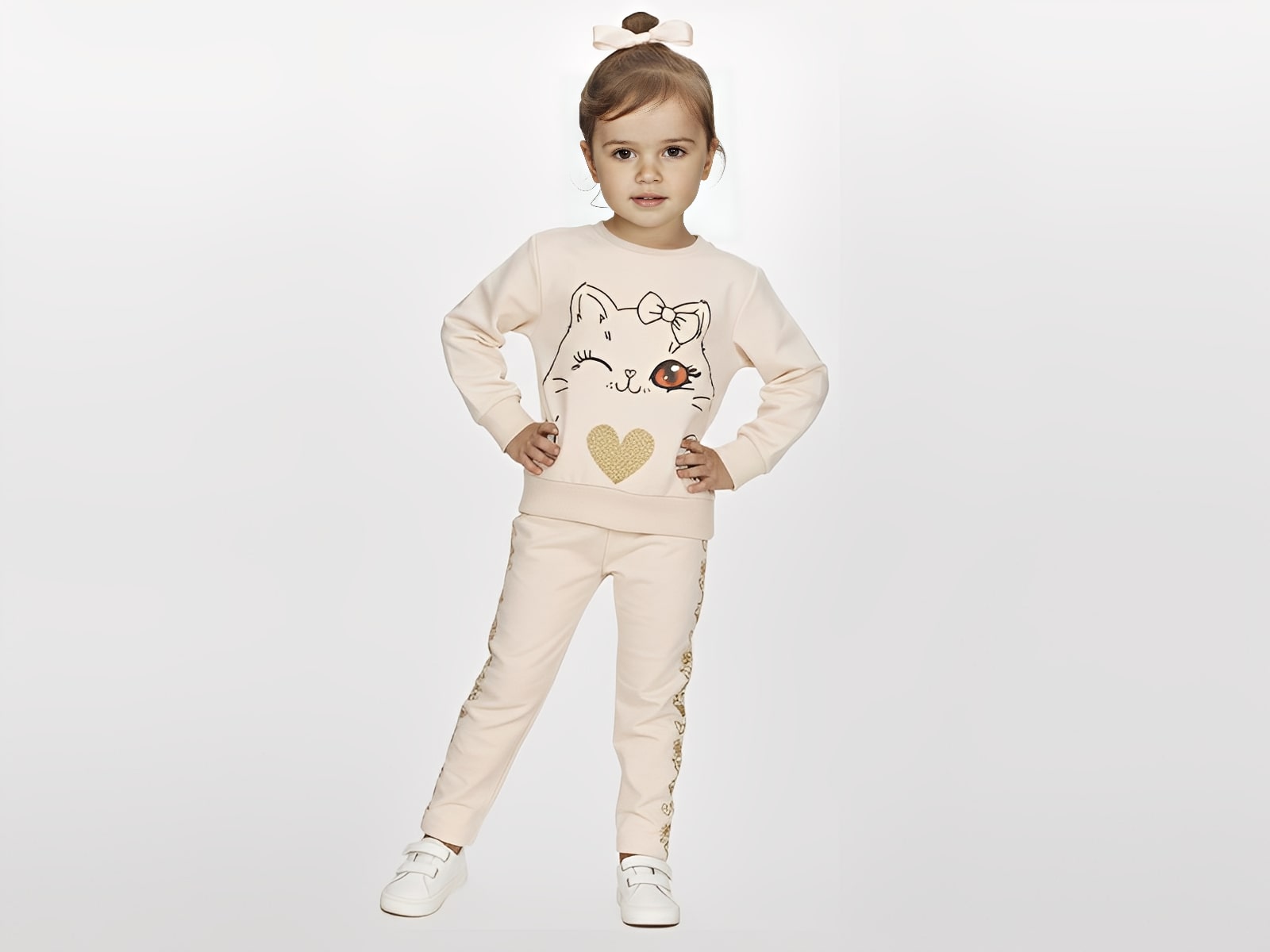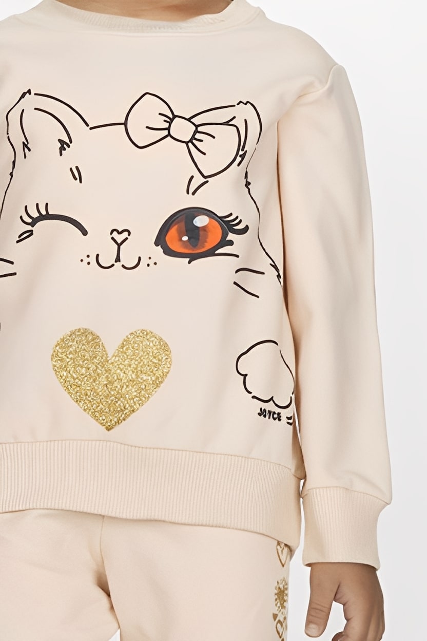 Το σετ είναι χειμερινό και αποτελείται από παιδική μπλούζα και παντελόνι τα οποία έχουν επένδυση με ελαφρύ χνουδάκι, από την εταιρία Joyce. Η μπλούζα είναι σε μπεζ χρώμα με σχέδιο στάμπα γατούλα και καρδιά διακοσμημένη με γκλίτερ. Το παντελόνι είναι και αυτό σε μπεζ χρώμα έχει λάστιχο περιμετρικά στη μέση και γκλίτερ στα πλάγια.