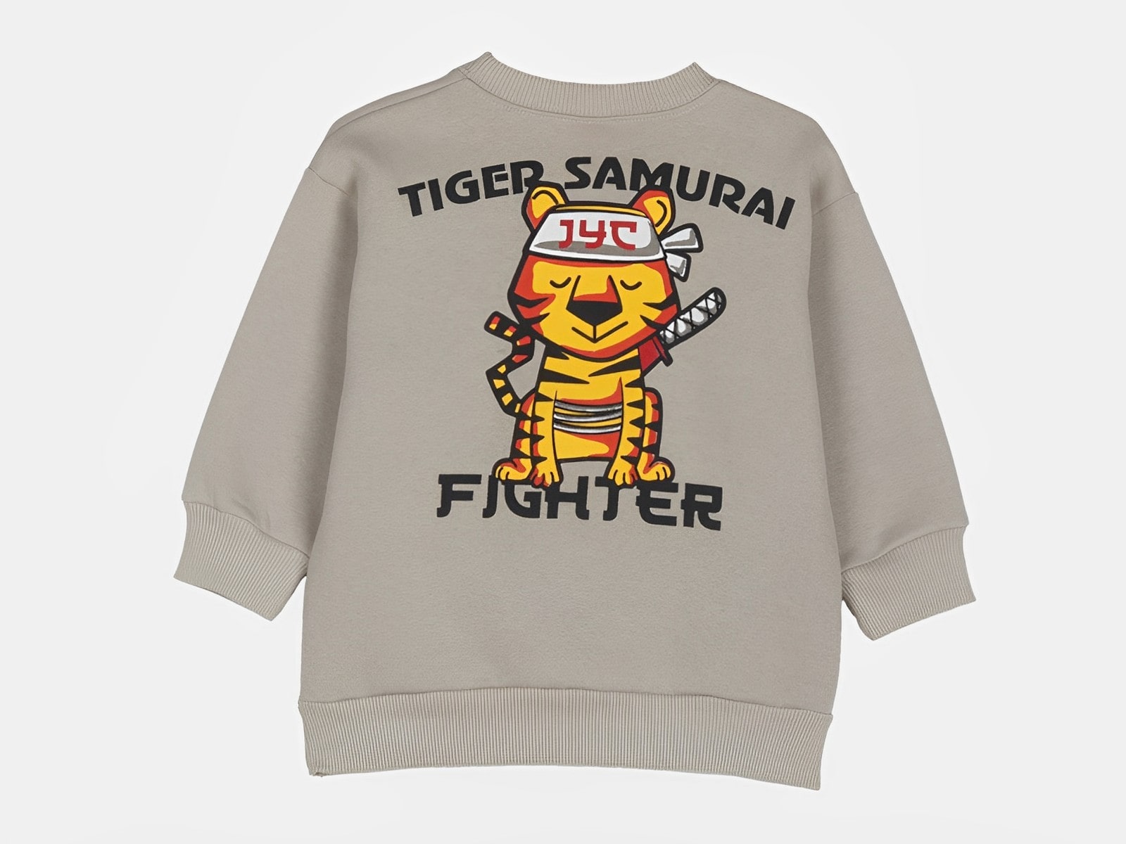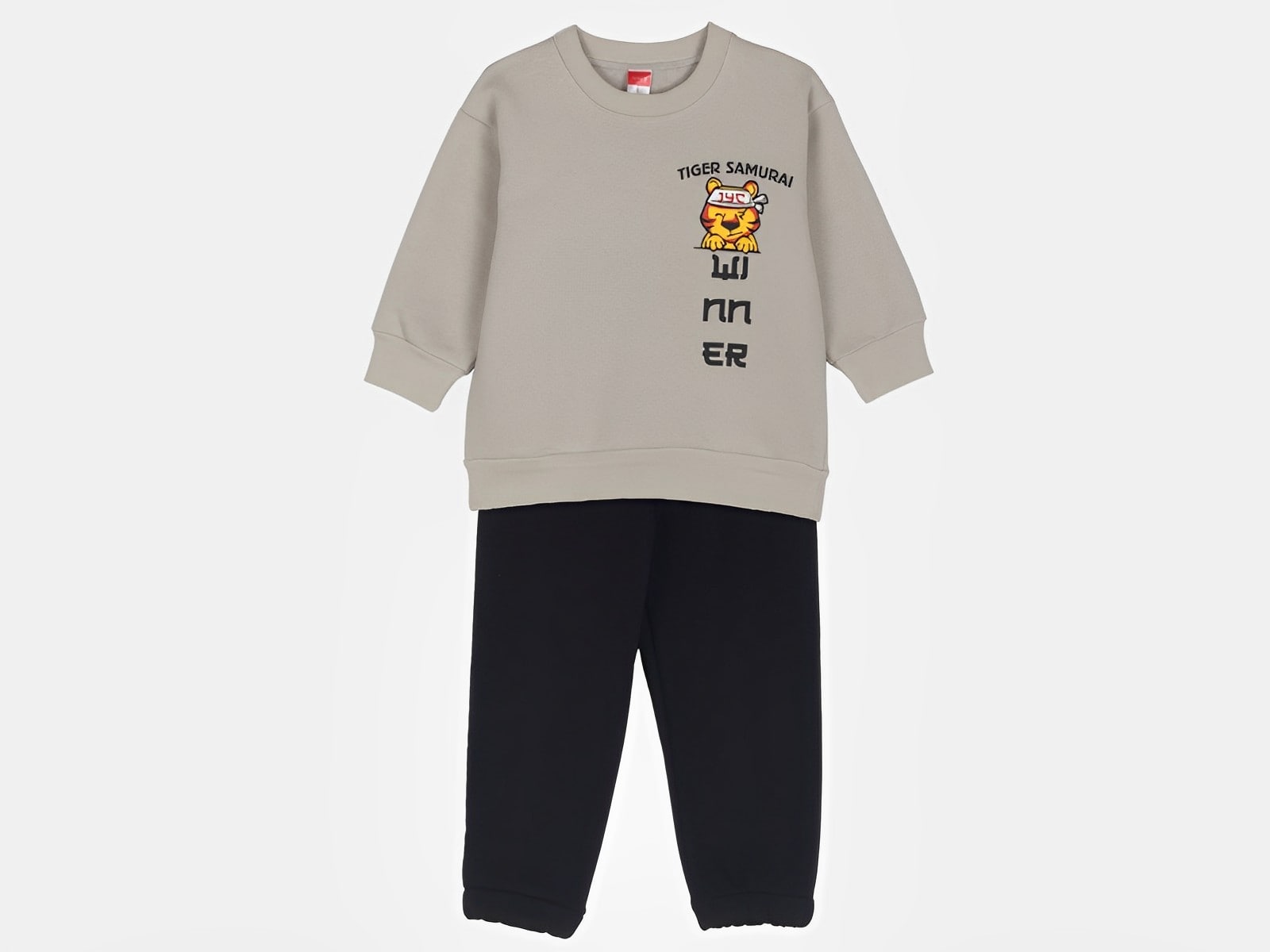 Το σετ αποτελείται από παιδική μπλούζα και παντελόνι και είναι χειμερινό, με εσωτερική επένδυση χνούδι φλις (fleece), από την εταιρία Joyce. Η μπλούζα είναι σε μπεζ χρώμα και έχει σχέδιο στάμπα τιγράκι στο μπορστά και πίσω μέρος που γράφει “Tiger Samurai Fighter”. Το παντελόνι είναι σε μαύρο χρώμα με τσεπούλες και έχει λάστιχο περιμετρικά στη μέση και στο κάτω μέρος.