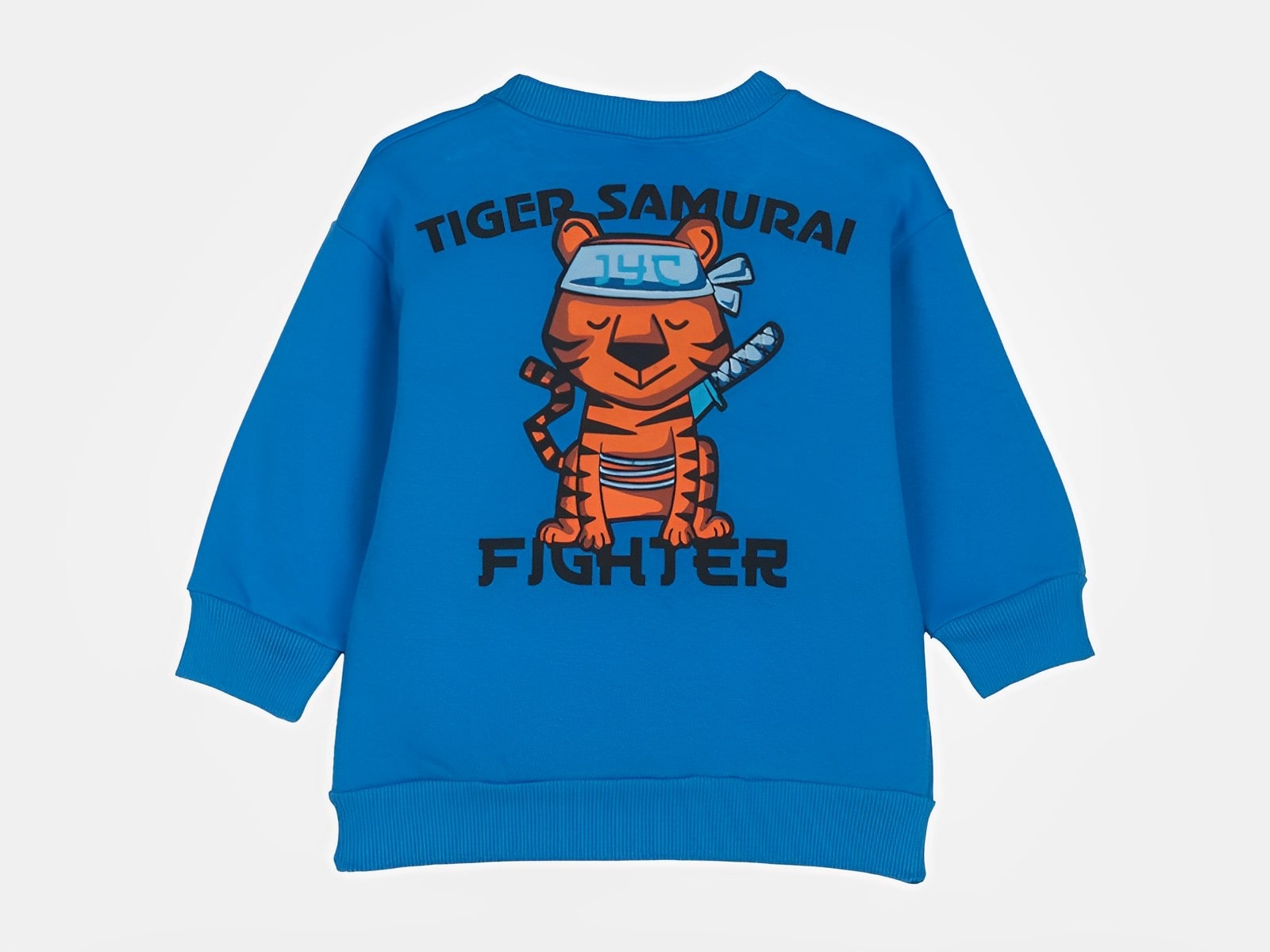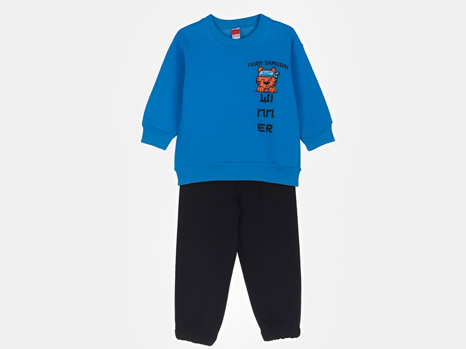 Το σετ αποτελείται από παιδική μπλούζα και παντελόνι και είναι χειμερινό, με εσωτερική επένδυση χνούδι φλις (fleece), από την εταιρία Joyce. Η μπλούζα είναι σε μπλε χρώμα και έχει σχέδιο στάμπα τιγράκι στο μπορστά και πίσω μέρος που γράφει “Tiger Samurai Fighter”. Το παντελόνι είναι σε μαύρο χρώμα με τσεπούλες και έχει λάστιχο περιμετρικά στη μέση και στο κάτω μέρος.