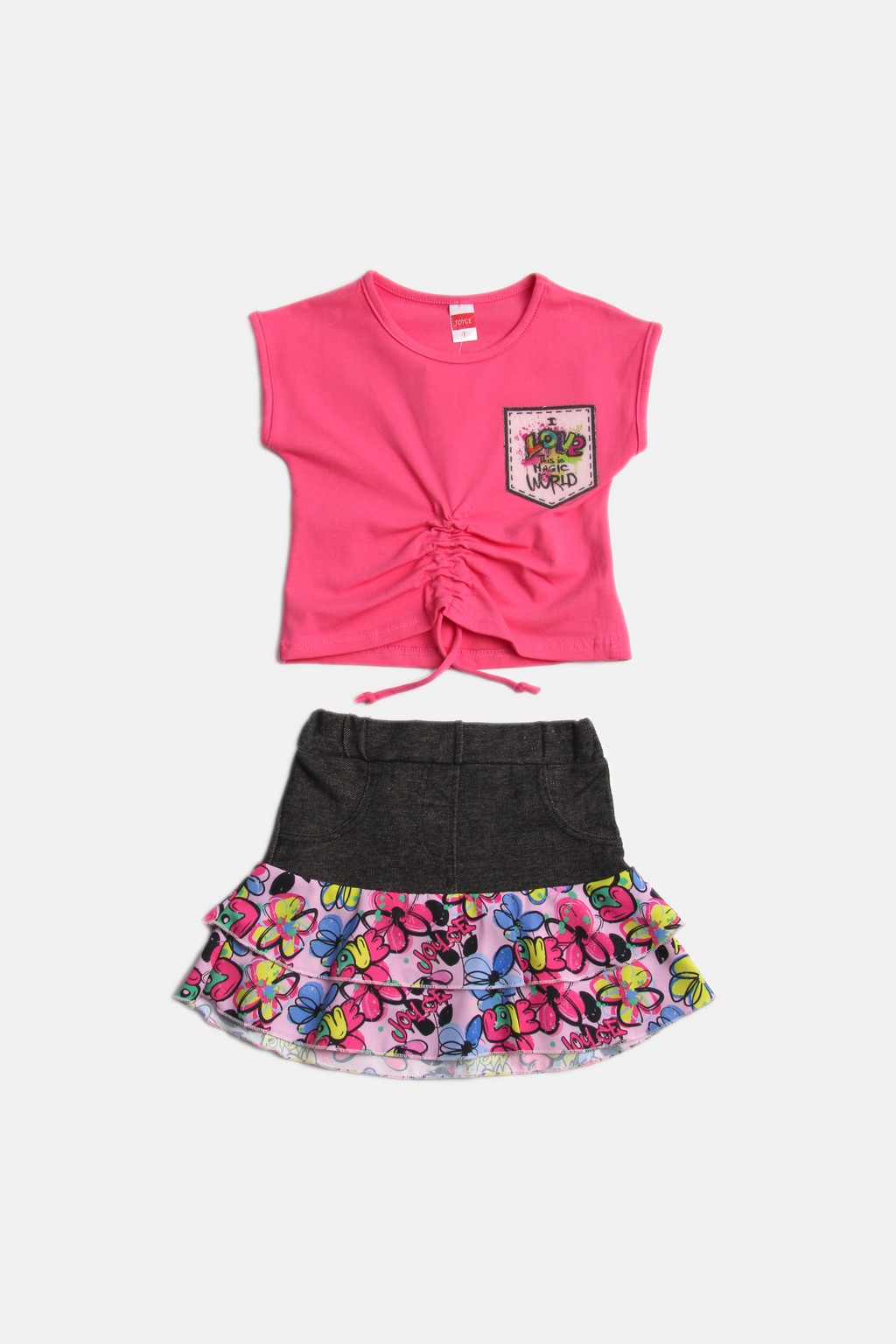 Καλοκαιρινό παιδικό σετάκι από την εταιρία Joyce το οποίο αποτελείται από μία αμάνικη μπλούζα και φουστίτσα. Η μπλουζίτσα είναι σε φουξ χρώμα με κορδονάκι στην κοιλιά για να μπορεί να μαζεύει και έχει τύπωμα που γράφει “I Love, This Is Magic World”. Η φούστα έχει διχρωμία, 2 διακοσμητικές τσεπούλες και λάστιχο περιμετρικά της μέσης για μεγαλύτερη άνεση.