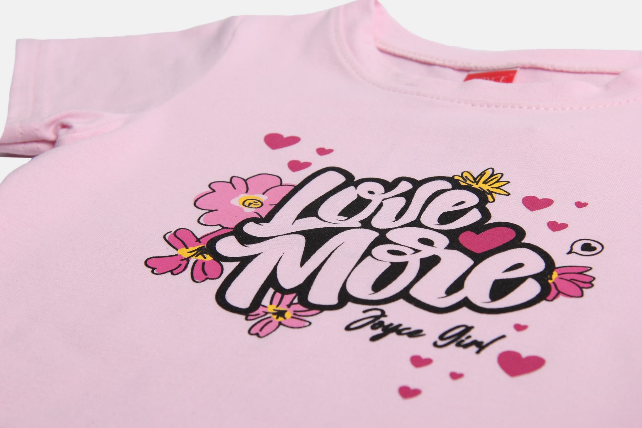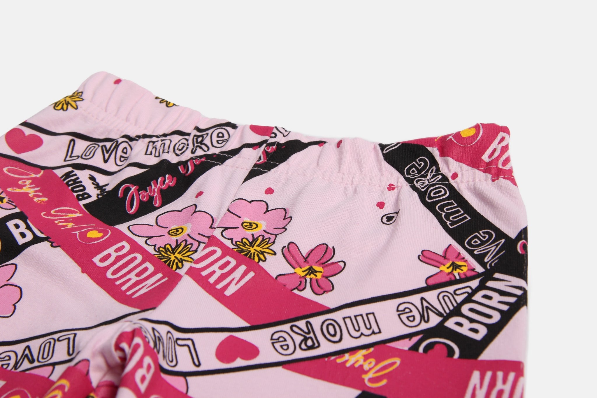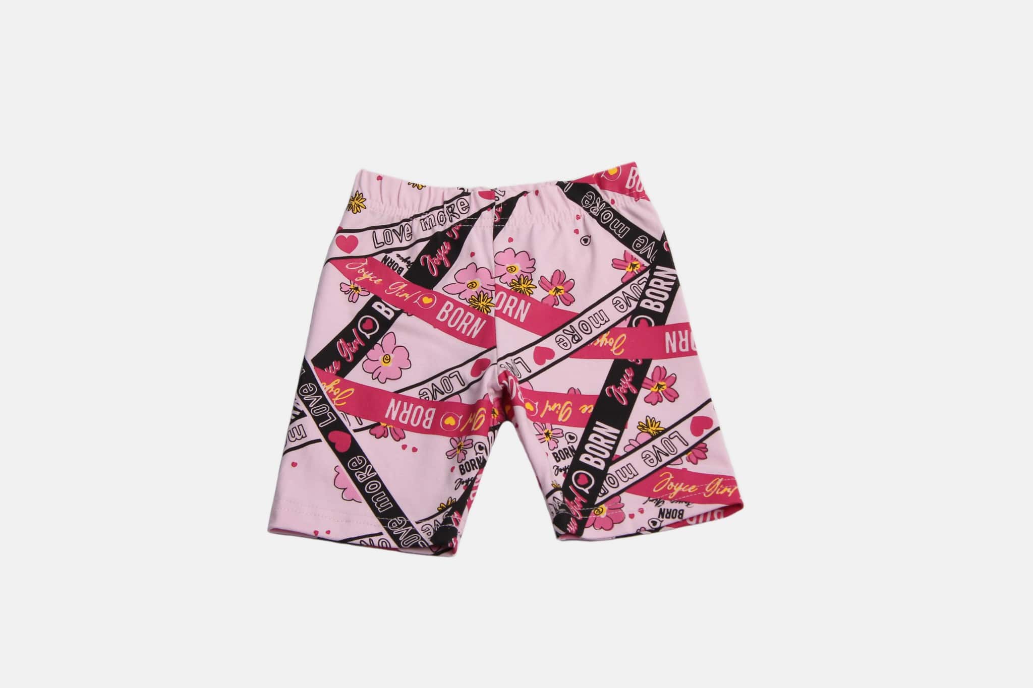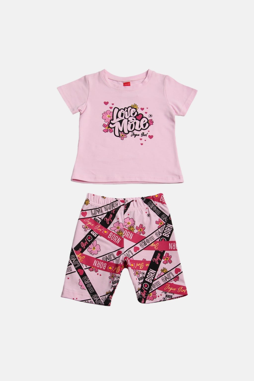 Καλοκαιρινό σετάκι από την εταιρία Joyce το οποίο αποτελείται από μία κοντομάνικη μπλούζα και ένα σορτσάκι. Η μπλουζίτσα είναι σε ροζ χρώμα και έχει τύπωμα σχέδιο λουλουδάκια και καρδούλες και γράφει “Love More”. Το σορτς είναι σε ροζ χρώμα, γράφει “Born” και έχει λάστιχο περιμετρικά στη μέση για μεγαλύτερη άνεση.