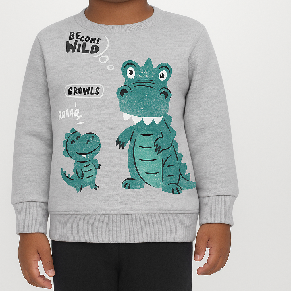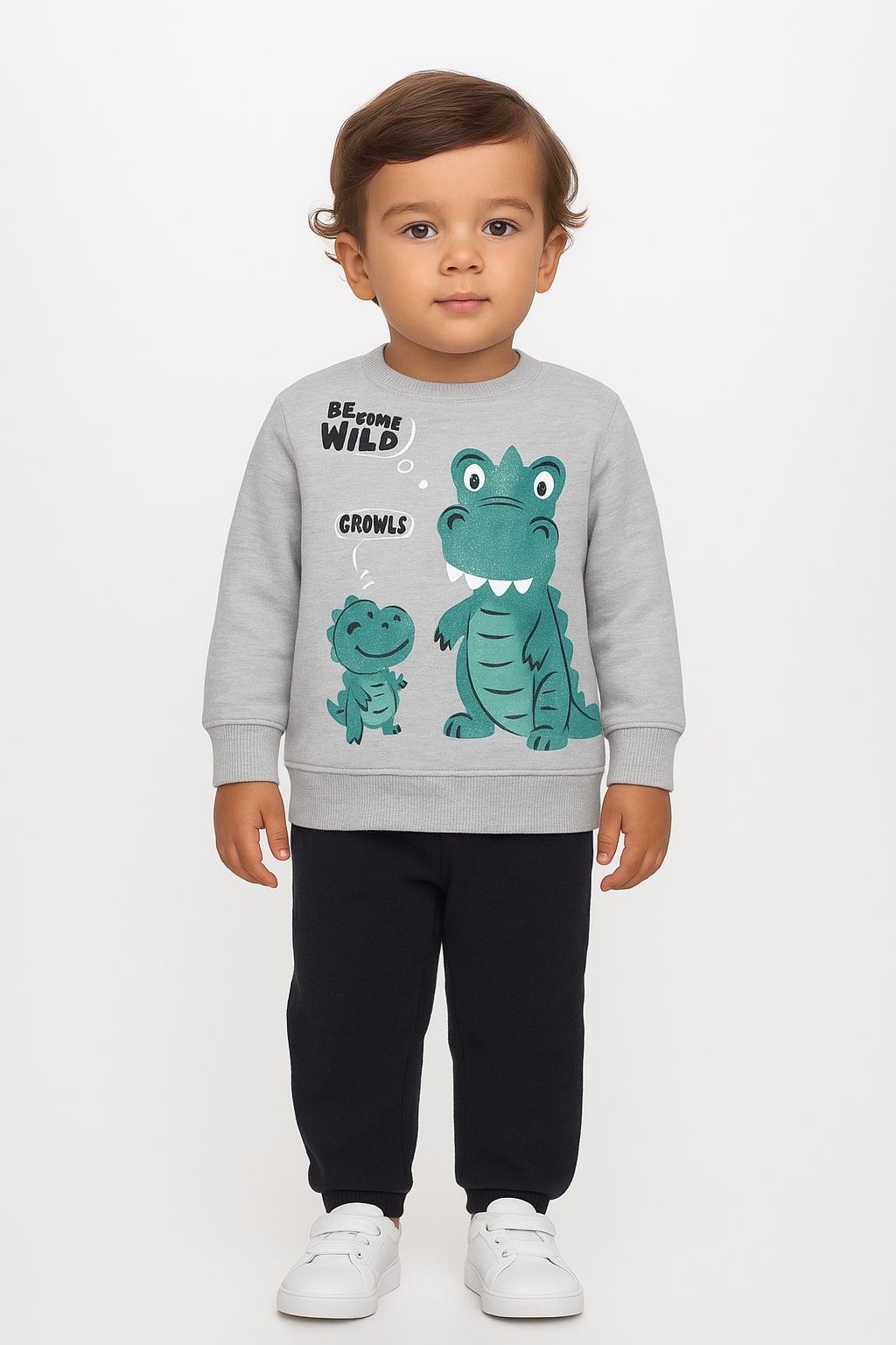 Το σετ αποτελείται από παιδική μπλούζα και παντελόνι και είναι χειμερινό, με εσωτερική επένδυση χνούδι φλις (fleece), από την εταιρία Joyce. Η μπλούζα είναι σε γκρι χρώμα και έχει σχέδιο στάμπα δεινοσαυράκια. Το παντελόνι είναι σε μαύρο χρώμα και έχει λάστιχο περιμετρικά στη μέση και στο κάτω μέρος.
