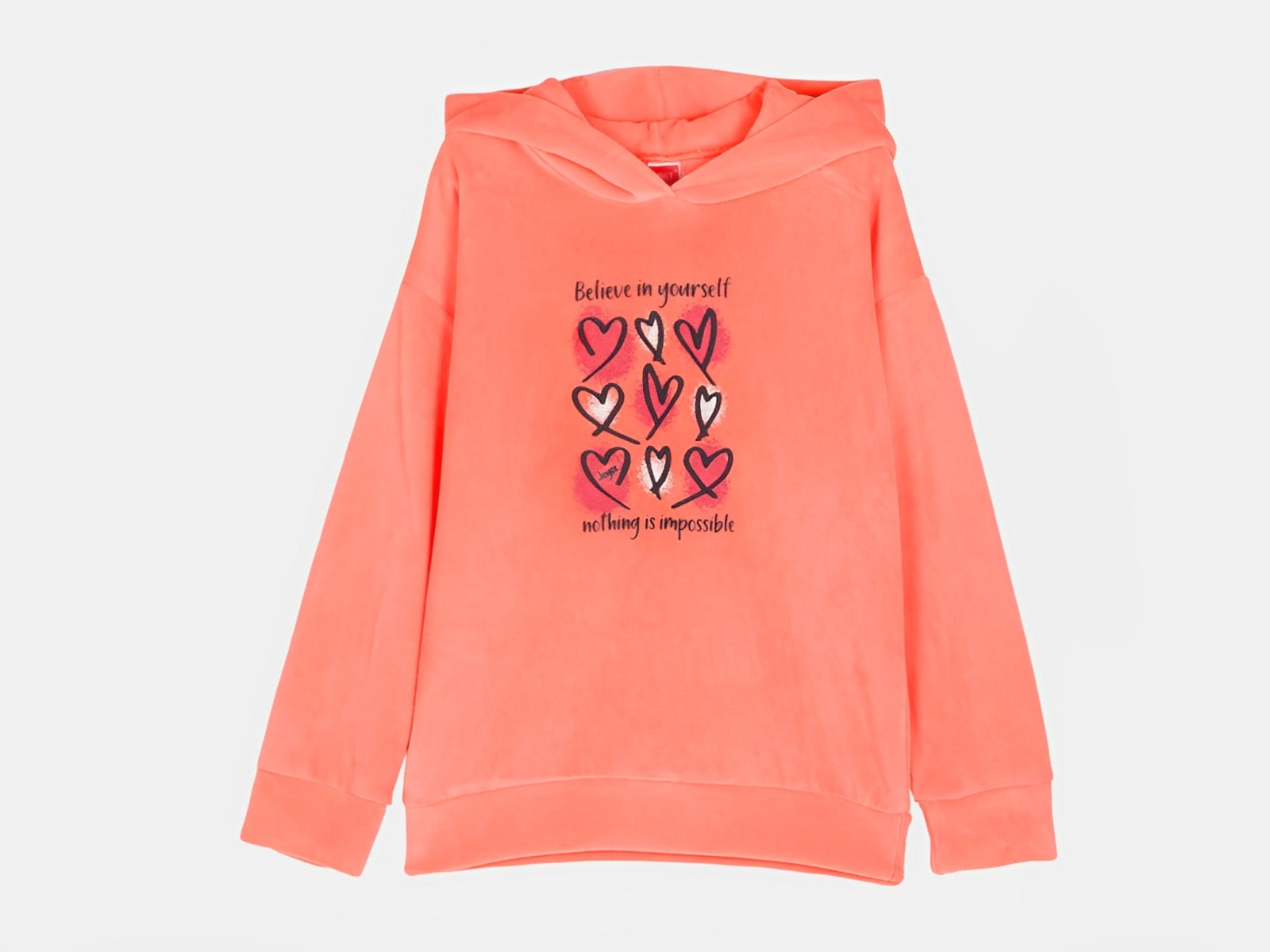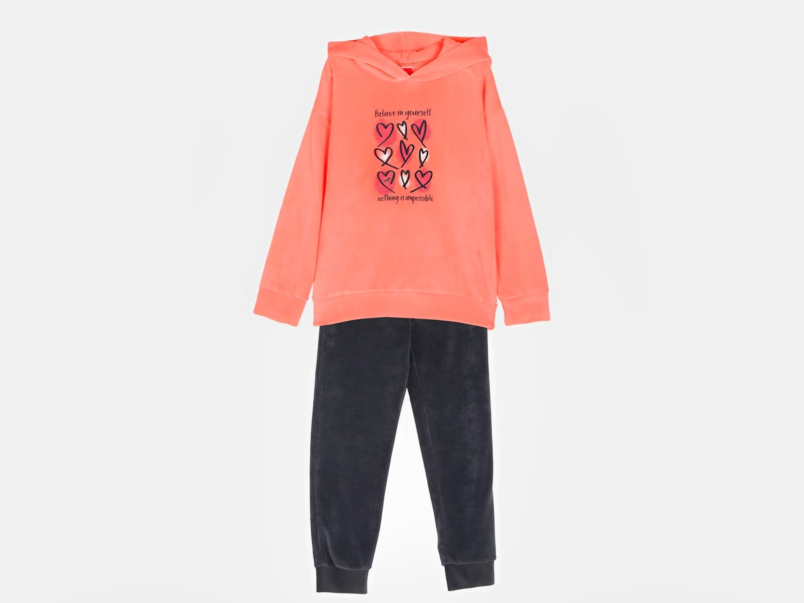 Βελουτέ σετ αποτελείται από χοντρή παιδική μπλουζίτσα και παντελόνι τα οποία είναι χειμερινά, με εσωτερική επένδυση, από την εταιρία Joyce. Η μπλούζα είναι σε σομόν χρώμα με κουκούλα και γράφει στο μπροστινό μέρος “Believe In Yourself Nothing Is Impossible”, ενώ έχει και σχέδιο με καρδούλες. Το παντελόνι είναι και αυτό βελουτέ γκρι μονόχρωμο και έχει λάστιχο περιμετρικά στη μέση και στους αστραγάλους. Είναι ιδανικές για να προσφέρουν άνεση και ζεστασιά στην καθημερινότητα και στο σχολείο!